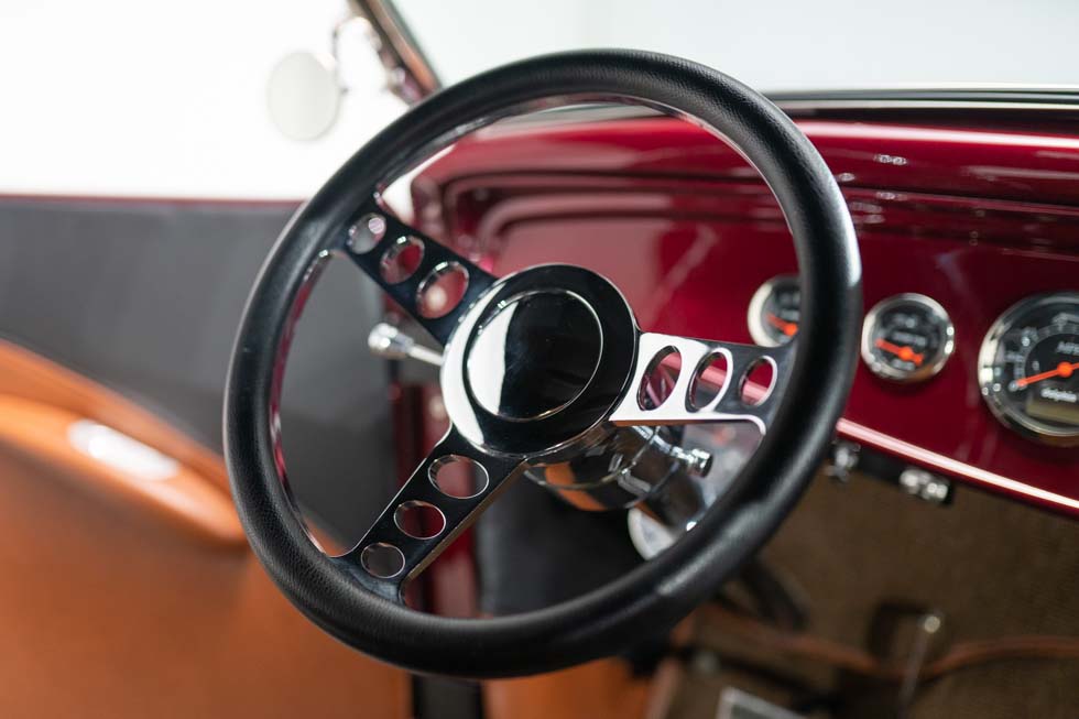 The custom saddle tan interior was designed by Jack’s Upholstery. A laid-back windshield and lift-off top. Speedway Motors grill shell and insert, radiator, and electric fan.
