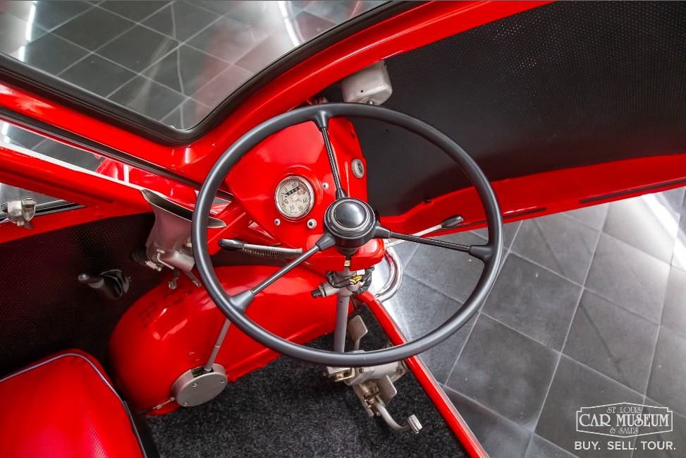 This Isetta was refinished in a period correct Red and White color combination with a two-tone red and black vinyl interior. Featuring a black cloth sunroof, heater, windshield defroster, 10” steel wheels with chrome hubcaps wrapped in BF Goodrich Silvertown tires. Since its arrival at our museum, we have replaced the battery, rubber shift boot, upper & lower engine mounts and changed the engine oil, transmission fluid, and chain case oil. One of only 3,925 U.S. models produced for 1958 and we are very pleased to showcase this BMW Isetta 300 that is sure to be the star of any show and grab attention anytime it is out. Thank you for your interest and please feel free to contact us regarding this rare piece of BMW microcar history!