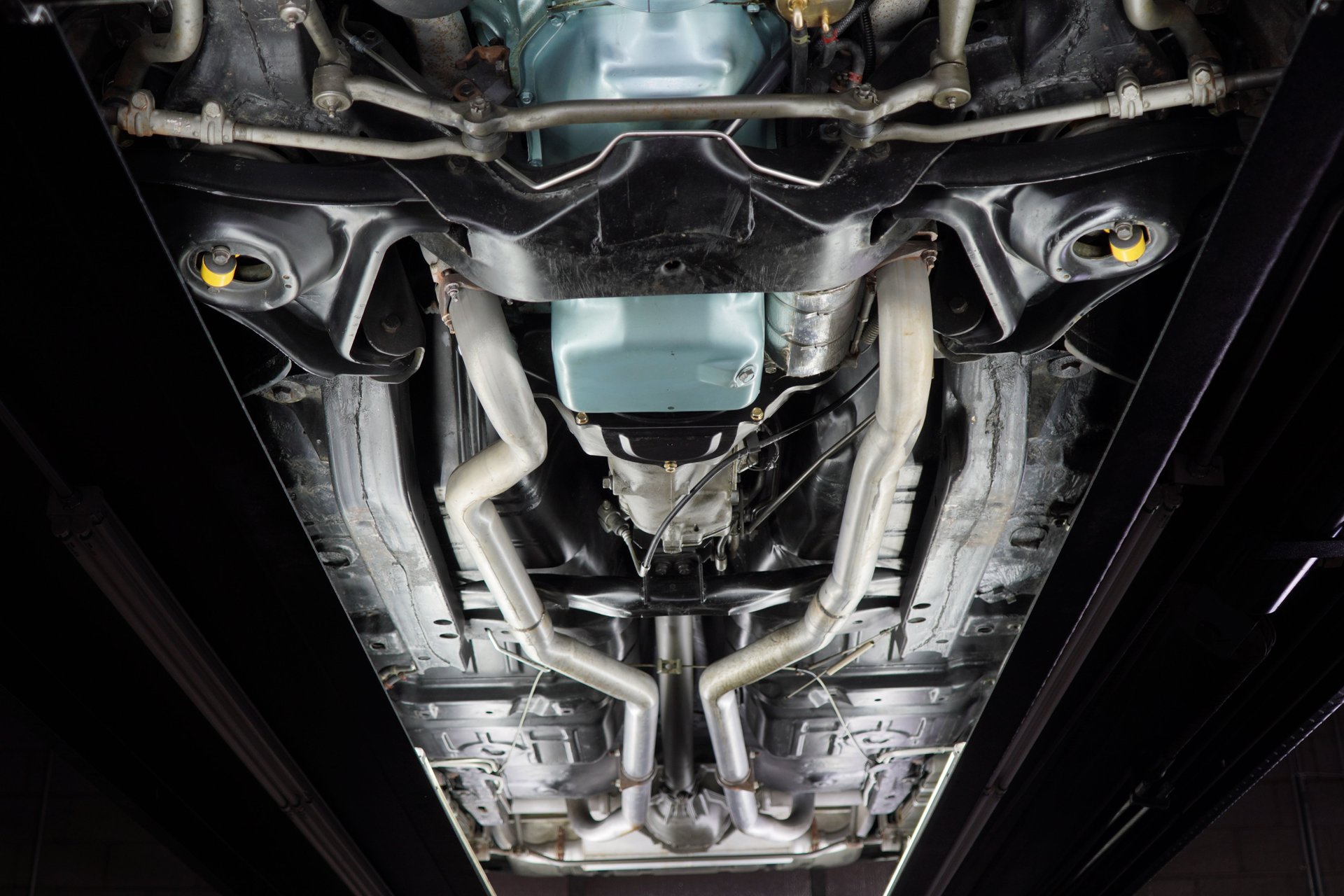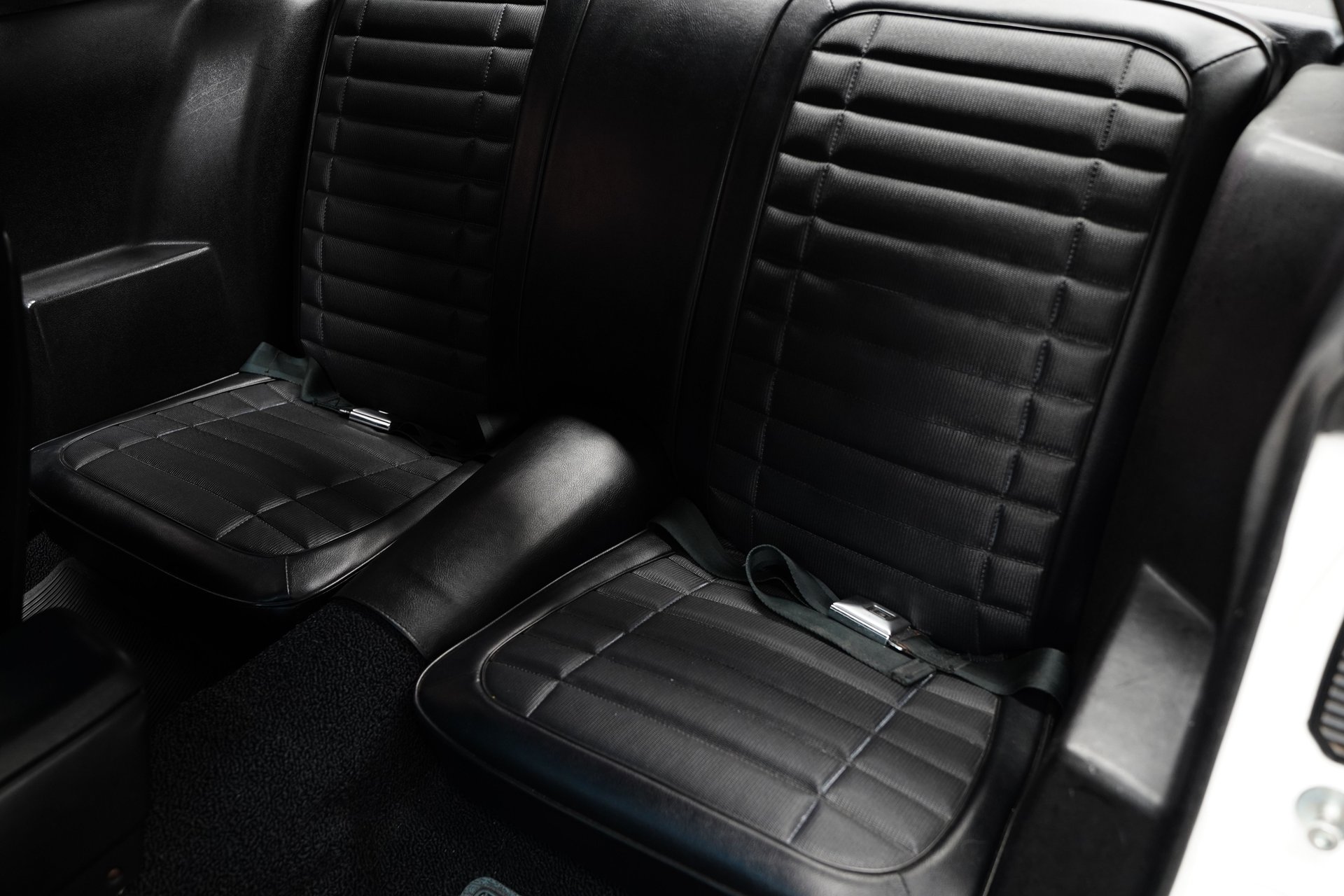 The cockpit is fitted with black (code 218) vinyl bucket seats up front and a two-seat rear bench as well as matching door panels, dash, headliner, center console, Hurst shifter and carpeting. Music comes from a push-button AM/FM transistor radio and a single speaker mounted in the center of the dashboard. Interior of the car is very clean with no rips or tears in the upholstery. The instrument panel features an engine-turned aluminum bezel and consists of a 160-mph speedometer, 8K-rpm tachometer, and supporting gauges for the fuel level, coolant temperature, oil pressure, and voltage.