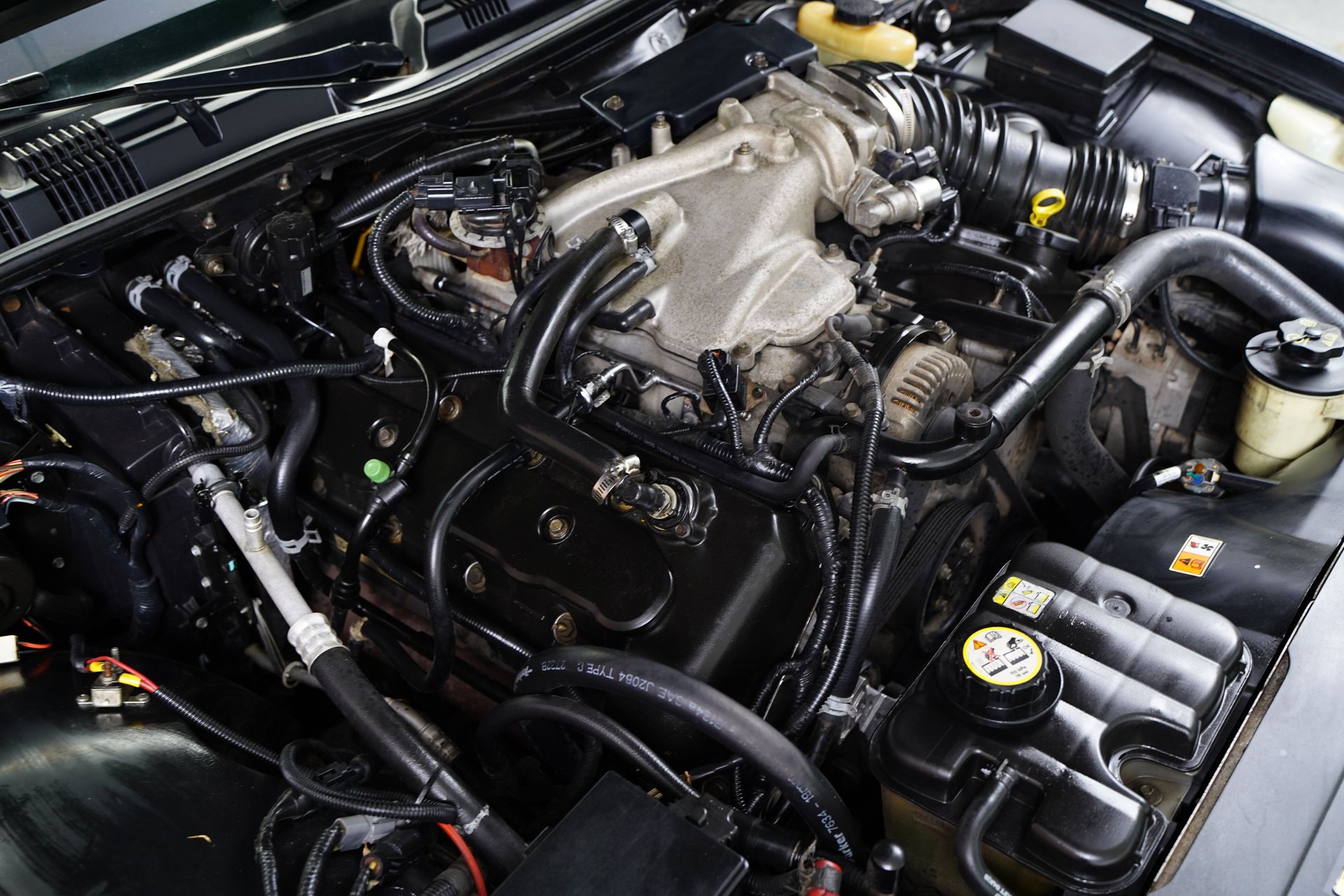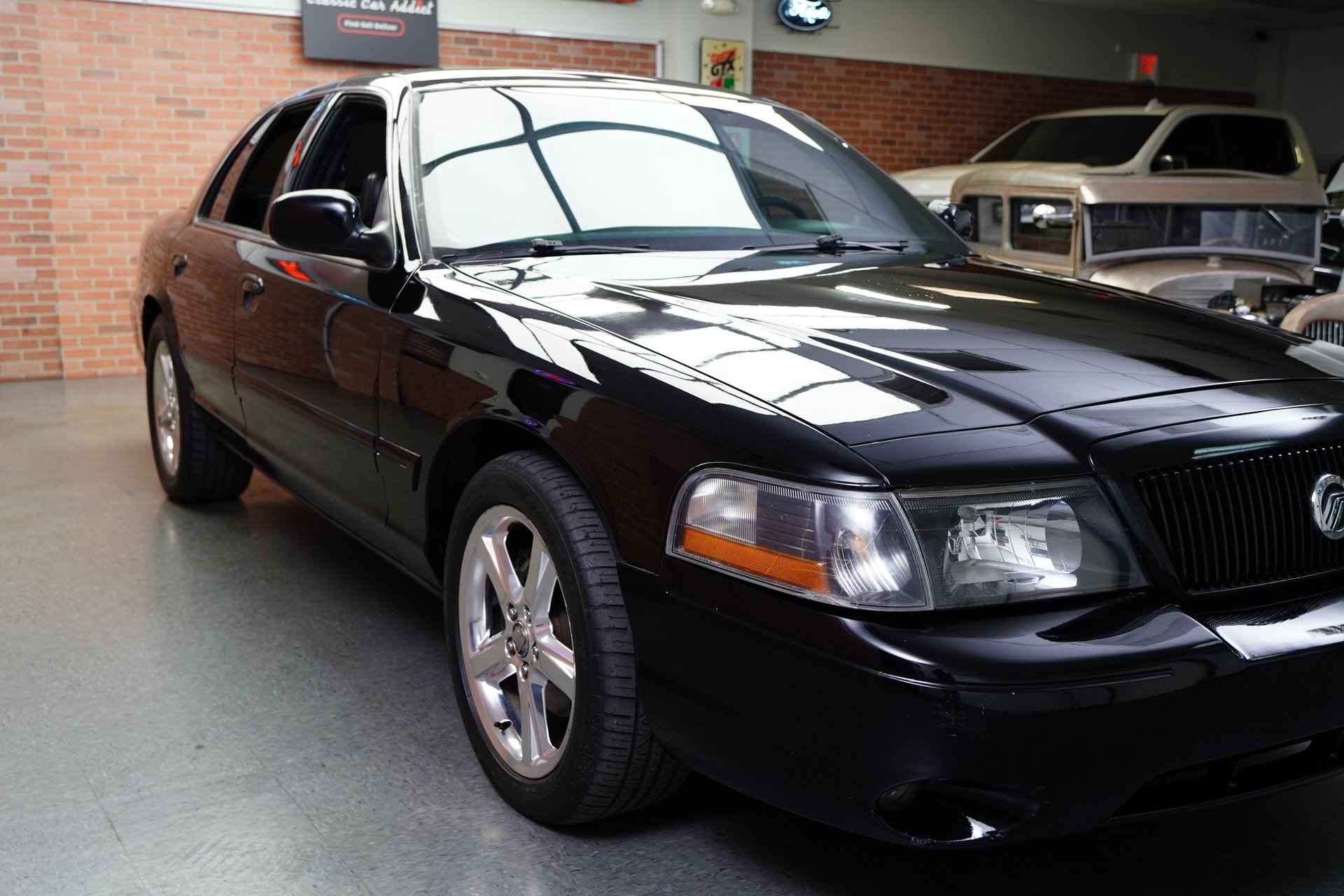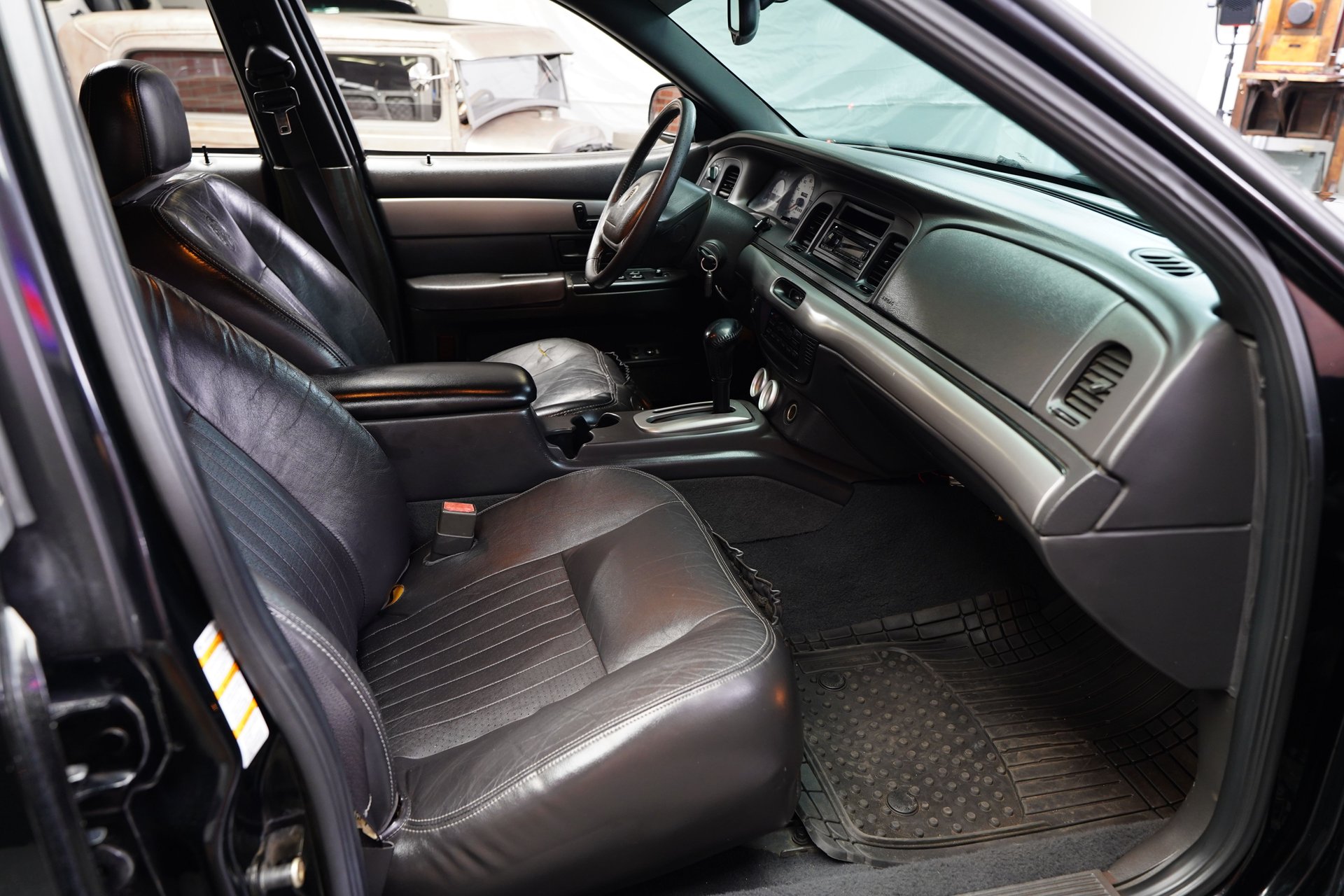 Just over 11,000 Marauders were built on Ford's Panther platform in Saint Thomas, Ontario, Canada, over the course of the car's two-year production run. This first-year example is finished in Black (UA), and it is equipped with black-trimmed headlights, cornering lights, fog lights, side-window rain guards, an exterior lock pad, heated power-adjustable side mirrors, and a dual exhaust system with chrome finishers. Polished 18″ five-spoke forged wheels are mounted with Cooper Tires. Braking is provided by four-wheel disc brakes with dual-piston front calipers, and the Marauder came standard with speed-sensitive variable assist power steering, Tokico monotube shocks, and self-leveling rear air suspension.
