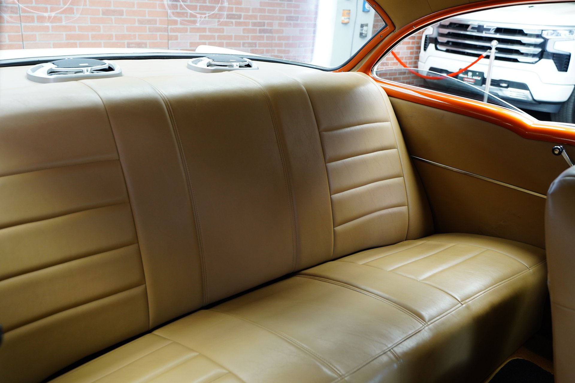 The cabin houses front bucket seats and rear bench that are trimmed in tan vinyl along with matching door panels and carpeting. Additional appointments include a B&M Quick Silver shifter, Insignia AM/FM/single CD radio, aftermarket air conditioning, analog clock, and locking glove compartment.