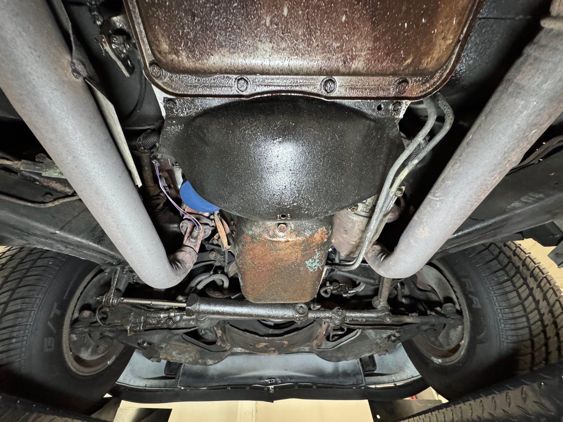 Where the rubber hits the road, things are relatively clean with the typical surface rust, some dried bushings, and oil film on the pan, flywheel cover, and steering components. Two pipes enter the catalytic converter, then split again to find individual stock style mufflers, ending as two tailpipes dumping discreetly in the back. Independent suspension is on front and back with coil springs under the nose and an independent suspension with transverse leaf springs and strut rods are out back. Power disc brakes are all around and bring this American sports car to a crawl, and then a stop.