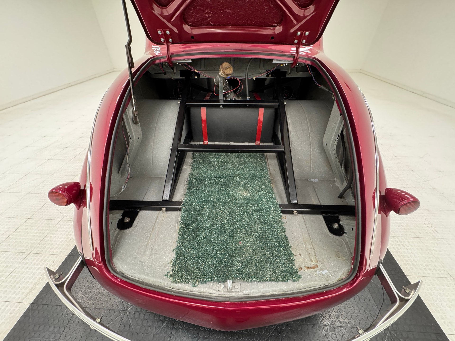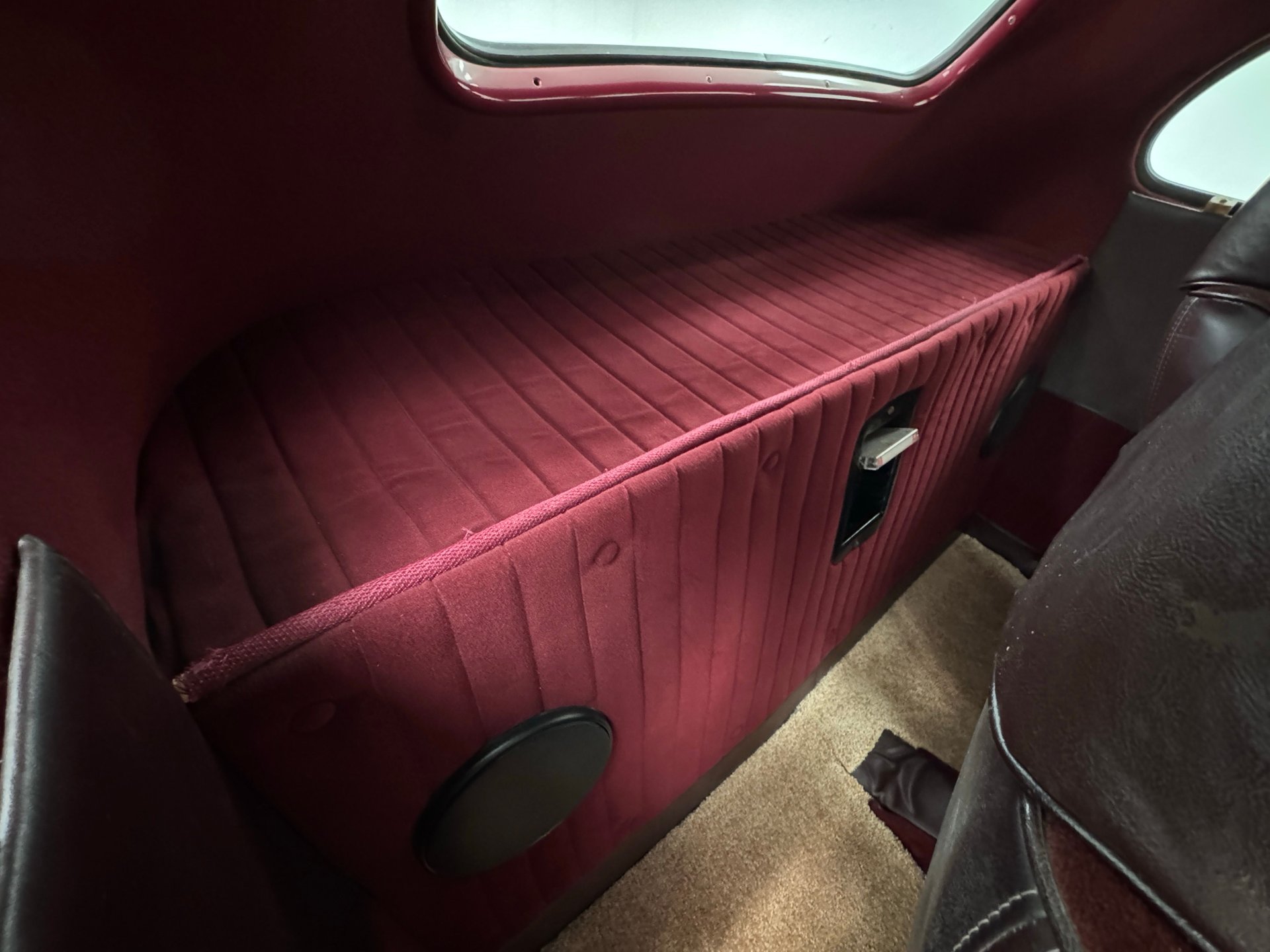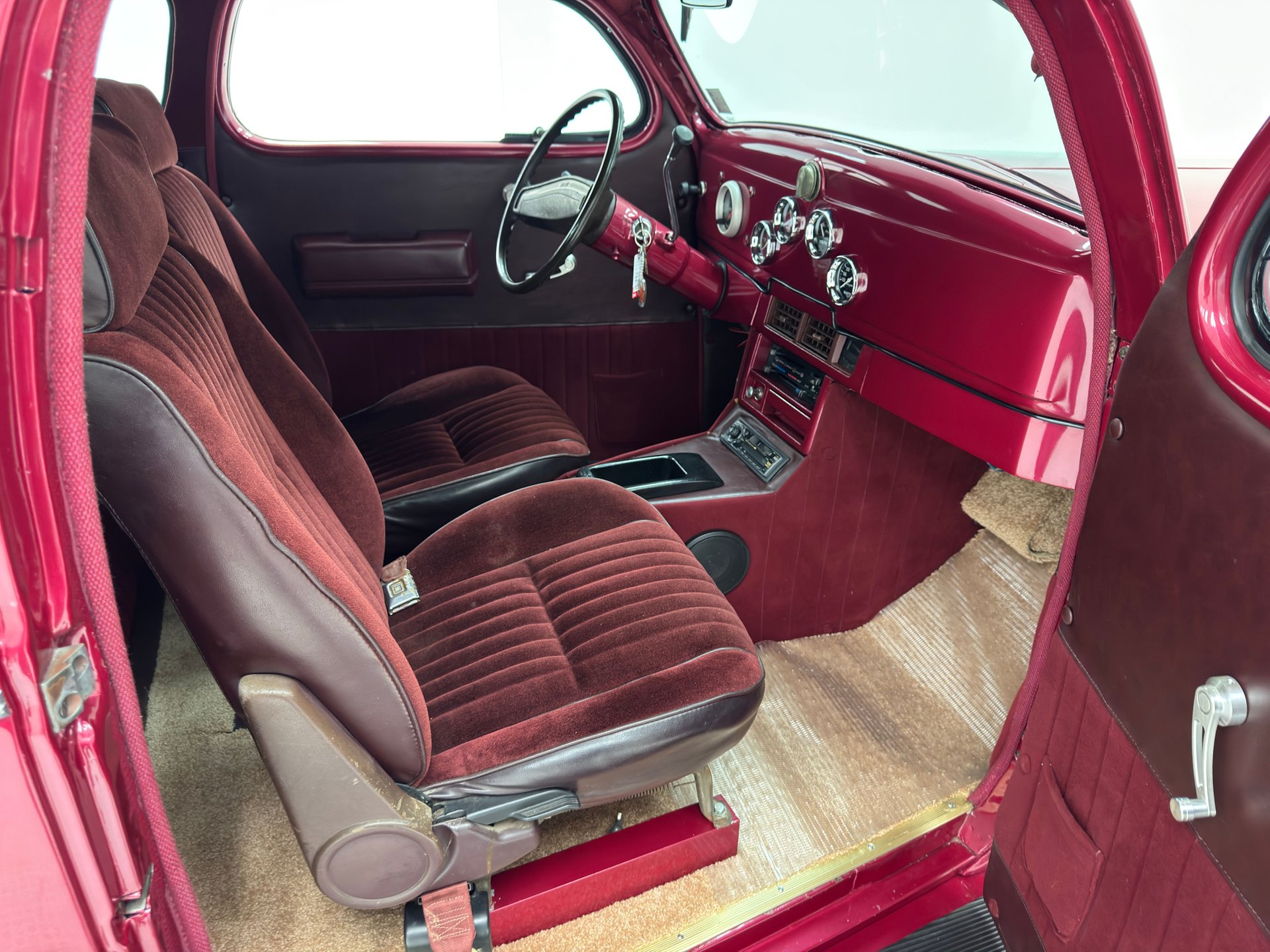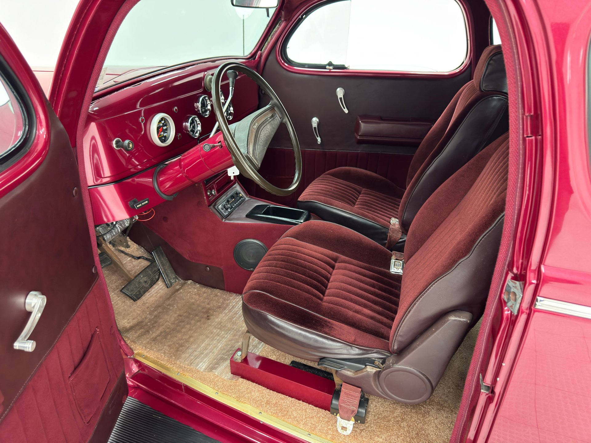 Burgundy door panels include a vinyl upper half, stitched cloth lower, and billet style hardware and both present cleanly. 80s/90's era bucket seats in burgundy velour occupy the front and other than some compression, remain clean and intact. Behind them is a package shelf and storage wrapped in the same stitched velour and show ready, and this material also covers the tall, center console which has storage bin where a shifter would be and an AM/FM/Cassette radio under the center stack where we find an A/C panel housed in the magenta base. A mid century steering wheel fronts the painted dash which puts an AutoMeter speedometer in front the four more gauges in the center. While here, we noted some rough cut material on the A-pillar outside of the windlace. Tan carpet pieces are on the floor, a burgundy headliner above, and a barren trunk with a tubular boxed gas tank and tubbed wheel wells finish our tour of the interior spaces.