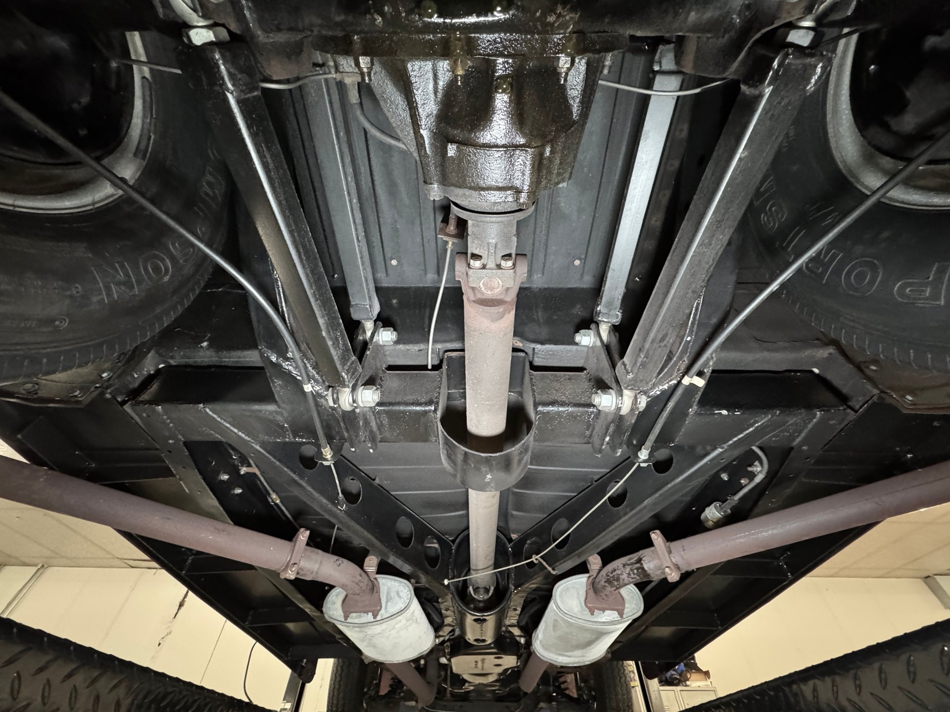Clean conditions are found underneath as well with the driveshaft moving through the X-frame and also a driveshaft loop. Dual exhaust runs in tandem through Turbo mufflers and exits ahead of each rear wheel. Brakes are on board as disc front and rear drum and suspension consists of a Mustang II front end and coilovers with ladder bars in back.