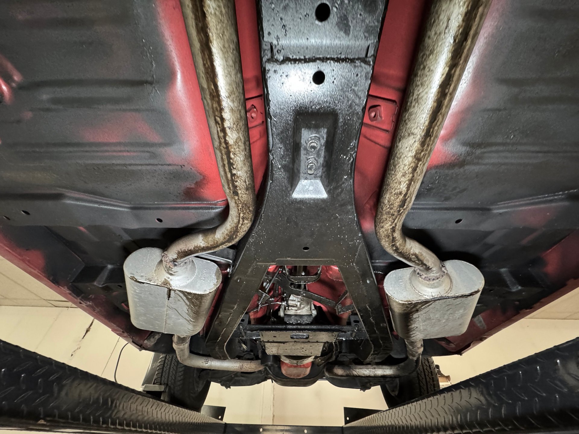 Clean underneath with the exception of some road spray and oil on the pan which has drifted back to mark the flywheel cover and exhaust components. That exhaust is a dual system that flows through Thrush mufflers before finding an exit via chrome tips. Power drum brakes are supplied to all four wheels and suspension is configured as coil springs up front and a 3 link, coil springs, and a panhard bar out back.