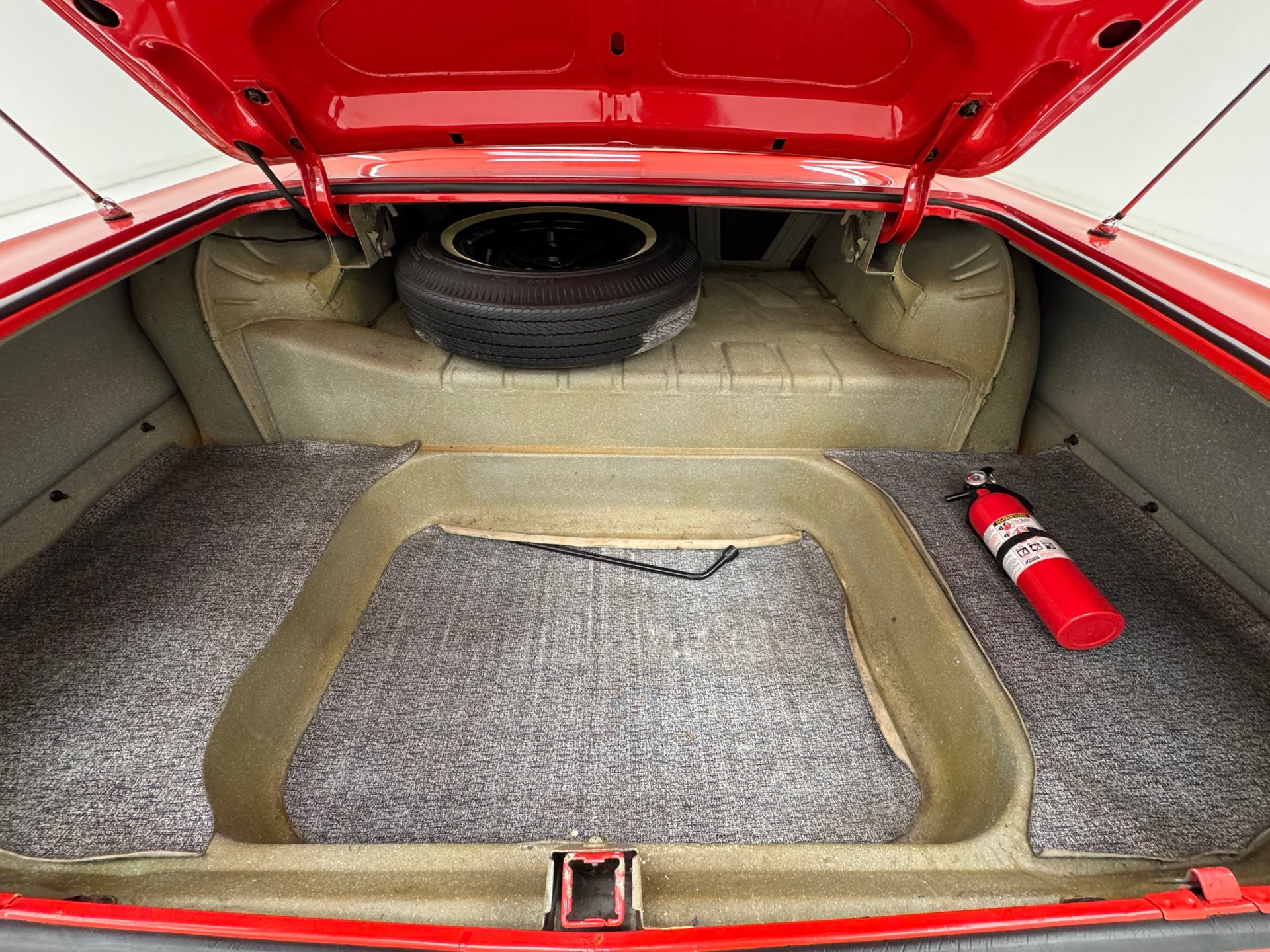 A swing of the door and we see some classic 60's touches with grain vinyl decorated with grommets and carpeted lowers on the door panels. As we move inside two original looking wide buckets in red vinyl, showing some patina and a few tears, contrasted by the chrome frame. The rear bench presents cleanly. A shiny red steering wheel with horn ring is offered to the driver who has a view of the red dash, horizontal gauges, tach on the column, and spun aluminum mid panel with switchgear and an AM/FM radio. A similar design back the triple VDO gauge pod that's been added under the dash, but your eyes will be drawn to the center console that is offset for the driver, the white ball shifter in a chrome base accented with more spun aluminum over red loops carpet and SS mats that have absorbed usage. The white headliner above is nice as is the trunk, which is clean and barren.