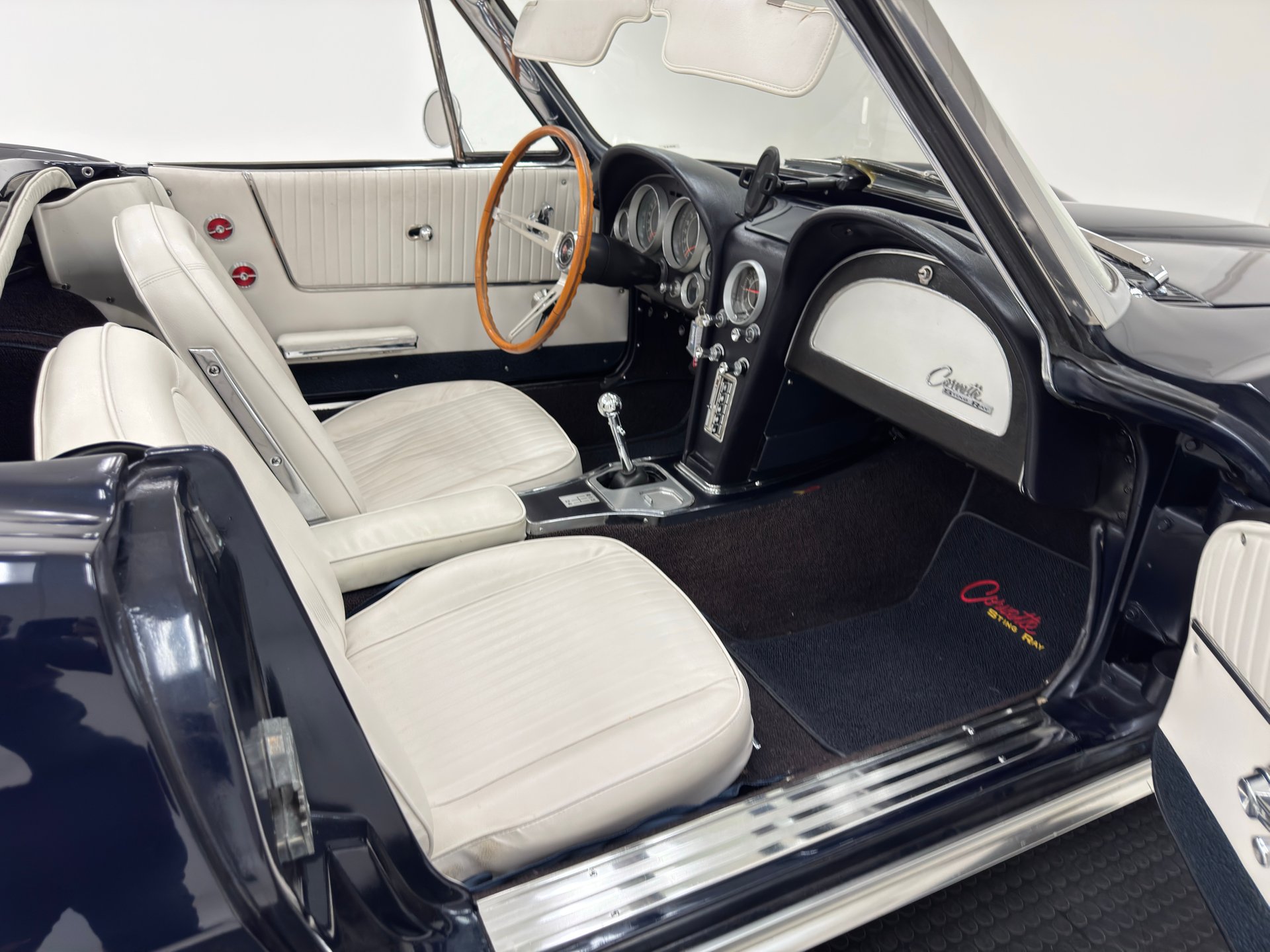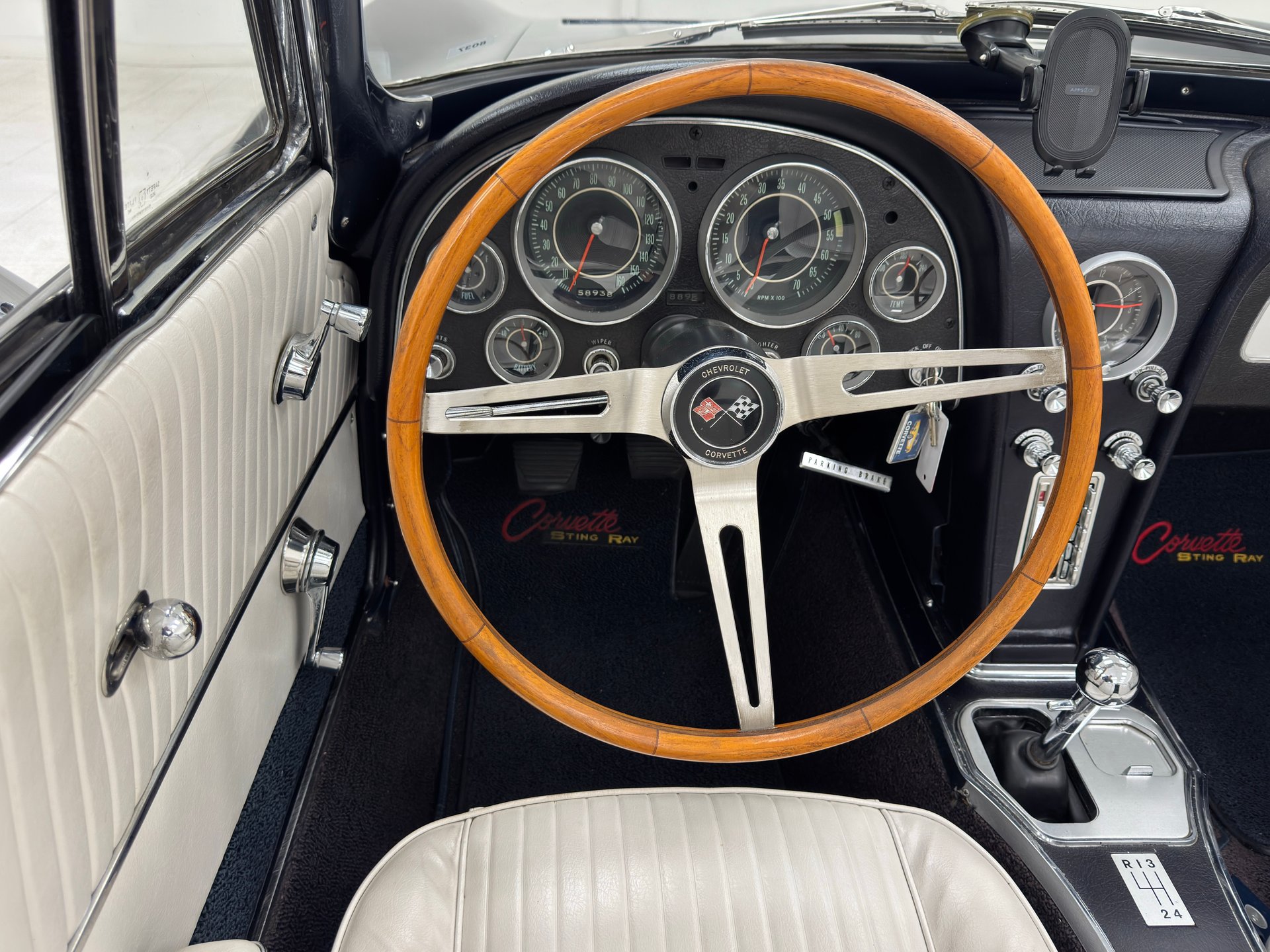 Swing open the doors to reveal a vertical pattern in white vinyl split by a chrome trim piece, then a smooth bottom panel. All the white blends with the chrome window cranks, sliding knob for a door actuator, and two jet age reflectors and both doors present well. White vinyl low back buckets are flanking a center armrest which sits behind a chrome edged center console. This houses the shifter with chrome ball knob, favoring the driver of course, and based in grain textured black plastic. In front of it, a side mounted AM/FM satellite capable radio, (the original comes with the car), various knobs and pulls and a large black faced clock. In front of the driver and passenger are two graceful cowls, one over the glovebox, and the other for the gauge cluster. Both have textured black plastic background which is clean, with the glovebox having a brushed aluminum door. The newer steering wheel is teak and the original comes with the car, this one retaining the crossed flag center badge. Black carpet in the foot wells also is clean and protected by Corvette Sting Ray branded mats.