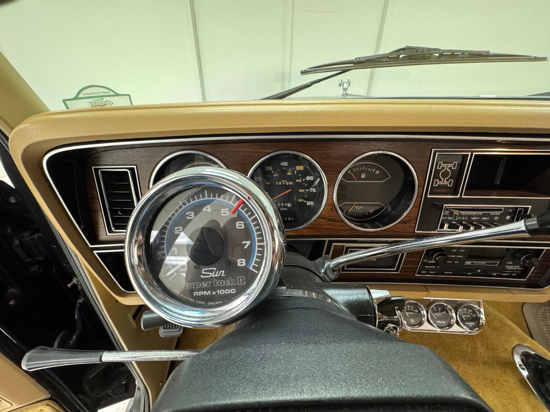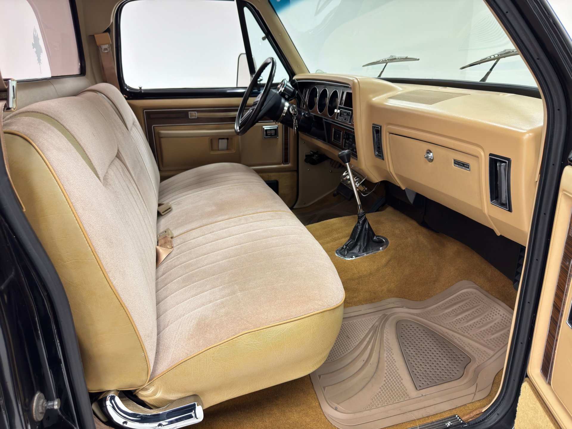 Tan plastic door cards are accented with dark woodgrain inserts over a carpeted panel below and both doors present in very good condition, opening up to the cloth bench seat that also is clean. A black steering wheel shares the column with a tachometer just in front of a woodgrain faced instrument cluster, A/C panel, drivetrain indicator, and AM/FM/cassette radio and it's all fantastically clean. A triple gauge pod has been added below and the tan plastic dash is immaculate and so is the tan carpet that covers the floor where a range selector stands tall in a black shift boot. The camel headliner is just about flawless and our rear window is a solid one.