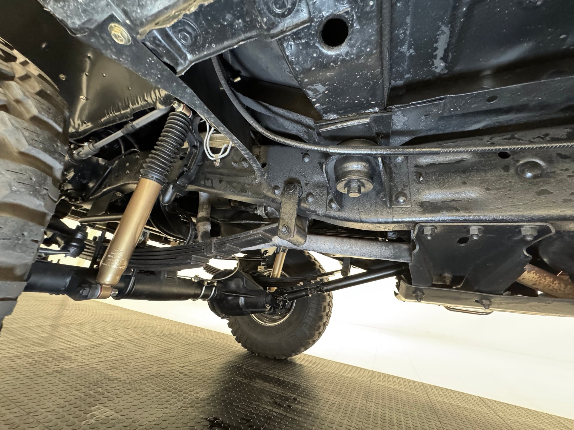 Thanks to gold shock absorbers, the black and gold motif continues on the clean underside where dual exhaust finds FlowMaster mufflers and exit via chrome tips. There are no catalytic converters on board. Power disc brakes are up front with power drums on the back and leaf springs are employed front and rear on this factory 4x4.