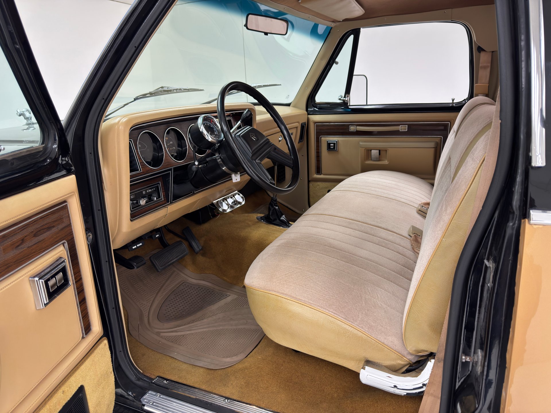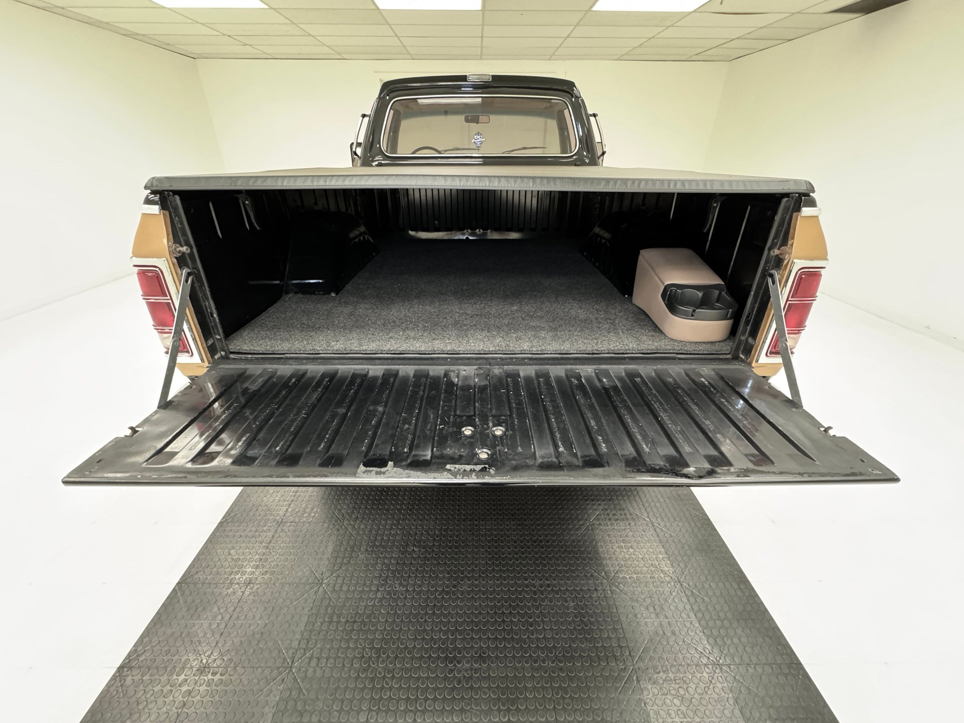 Dripping with strength, this tall truck is fronted by a finely detailed and aggressive ram hood ornament that surges forward, putting an exclamation point on the lane clearing attitude of the truck itself. Gold paint is sandwiched by black, both in two stage application and perfectly matched to the 15-inch wheels carrying massive 35x12.50R15 tires. Lots of chrome out front where single headlights over marker lights top the big and high bumper while out back, a brushed aluminum dress plate caps the tailgate over another impressive chrome bumper. Step ups dot the rocker panels and are a welcome convenience as are the handles on the C-pillar. The padded, vinyl tonneau cover is in great shape and the bed is glossy black and covered with a fitted cloth mat. We found no exterior imperfections on this 4x4!