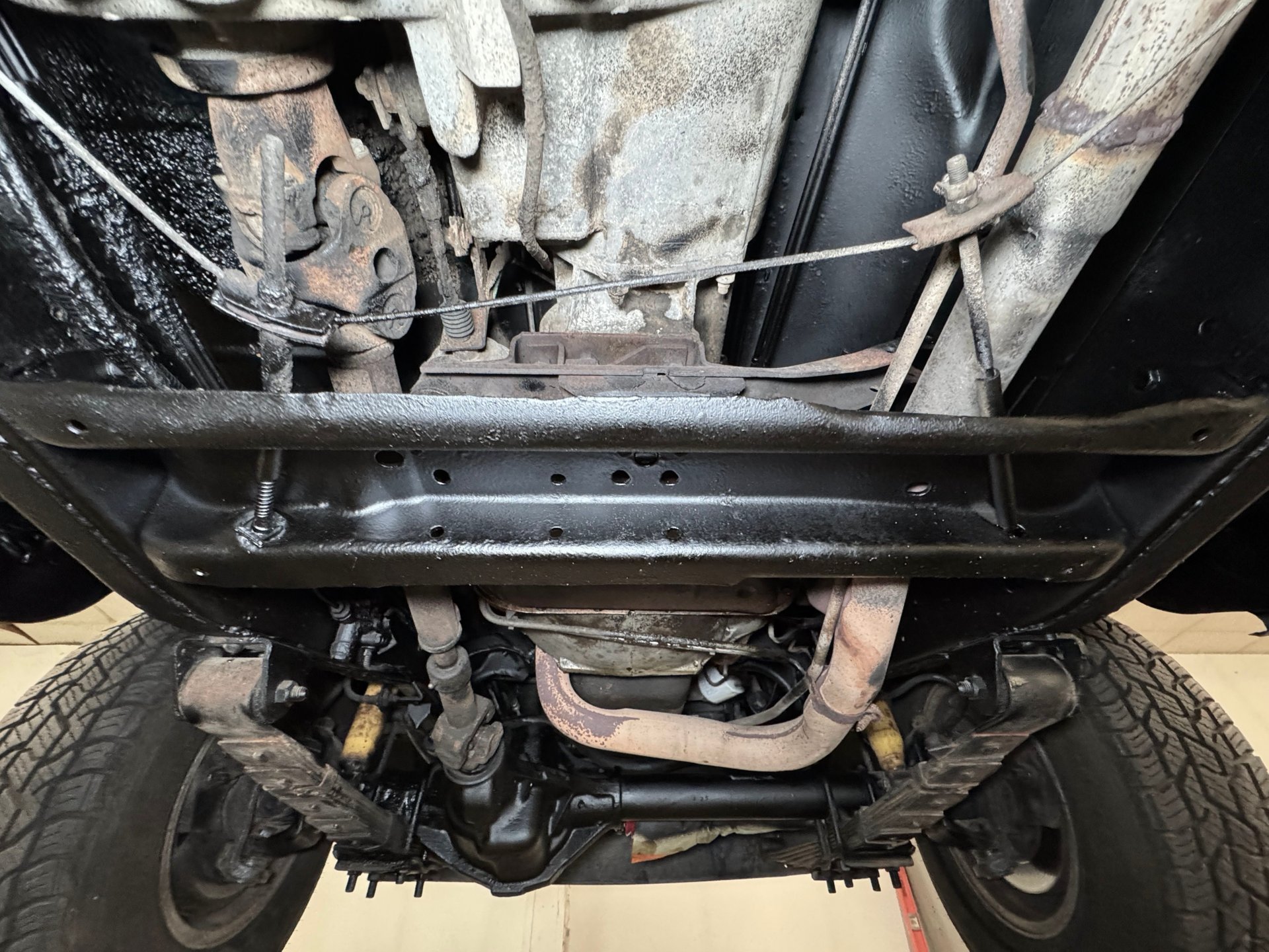 Fresh looking black paint mixes with typical patina of the componentry under the truck for an overall clean appearance. A single exhaust system flows through a stock style muffler, exiting via steel pipe behind a rear wheel. Power brakes are present and accounted for with disc in front and drum in the back and leaf springs are employed front and rear.