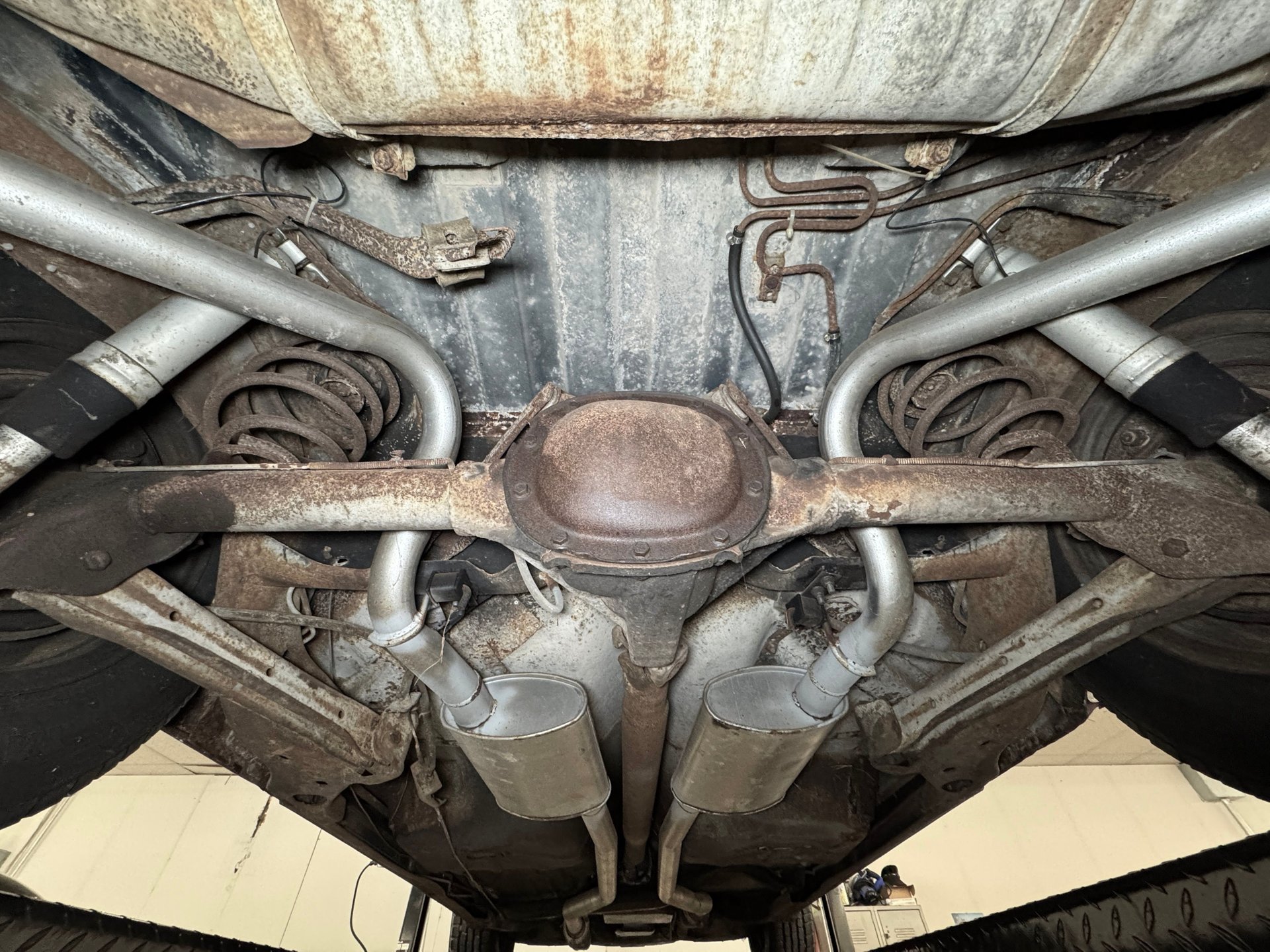 Typical and extensive surface rust is present mixed with dry condition and some rust through on stamped panels is noted. Power disc brakes are employed up front and power drums at the other end. Dual exhaust flows from the headers to Turbo mufflers and exit just behind the rear wheels and fender. There is no catalytic converter on board. Suspension consists of coil springs up front and a 4 link with coil springs in back.