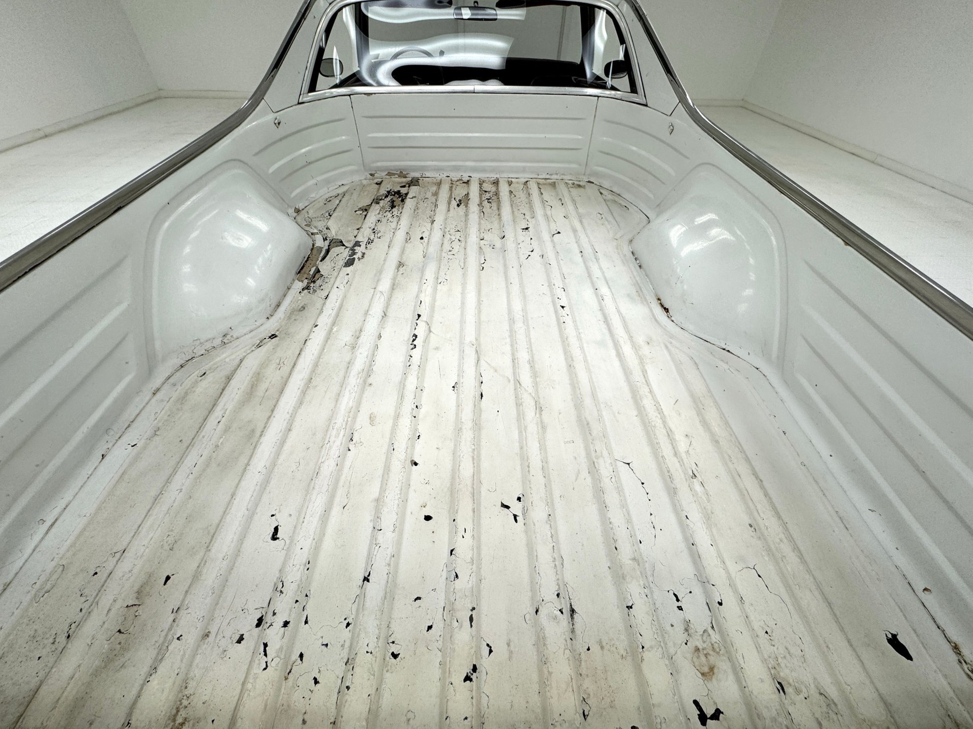 It's a Chevrolet Malibu coming at you, but from the side, the El Camino makes its mark, here dressed up in stylish white with maroon rocker panels and strobe stripes that ride the fenders and shoulder line and turn the corner to color the tailgate as well. A maroon bowtie has been added on that tailgate which goes with the Heartbeat decals on the side while the distinctive rear bumper holds the tail lights down low. C-pillars flare rearward creating buttress like panels beside the solid rear window and the A-pillars mirror the angle below a short roofline. 14-inch Chevrolet Rally wheels serve as the shoes here and look great and the bed is usable because it's been used. You won't be making the first scratch or mark, they're already there! Most of the other imperfections are centered around that red rocker where we find chipped paint, scratches, and paint runs.
