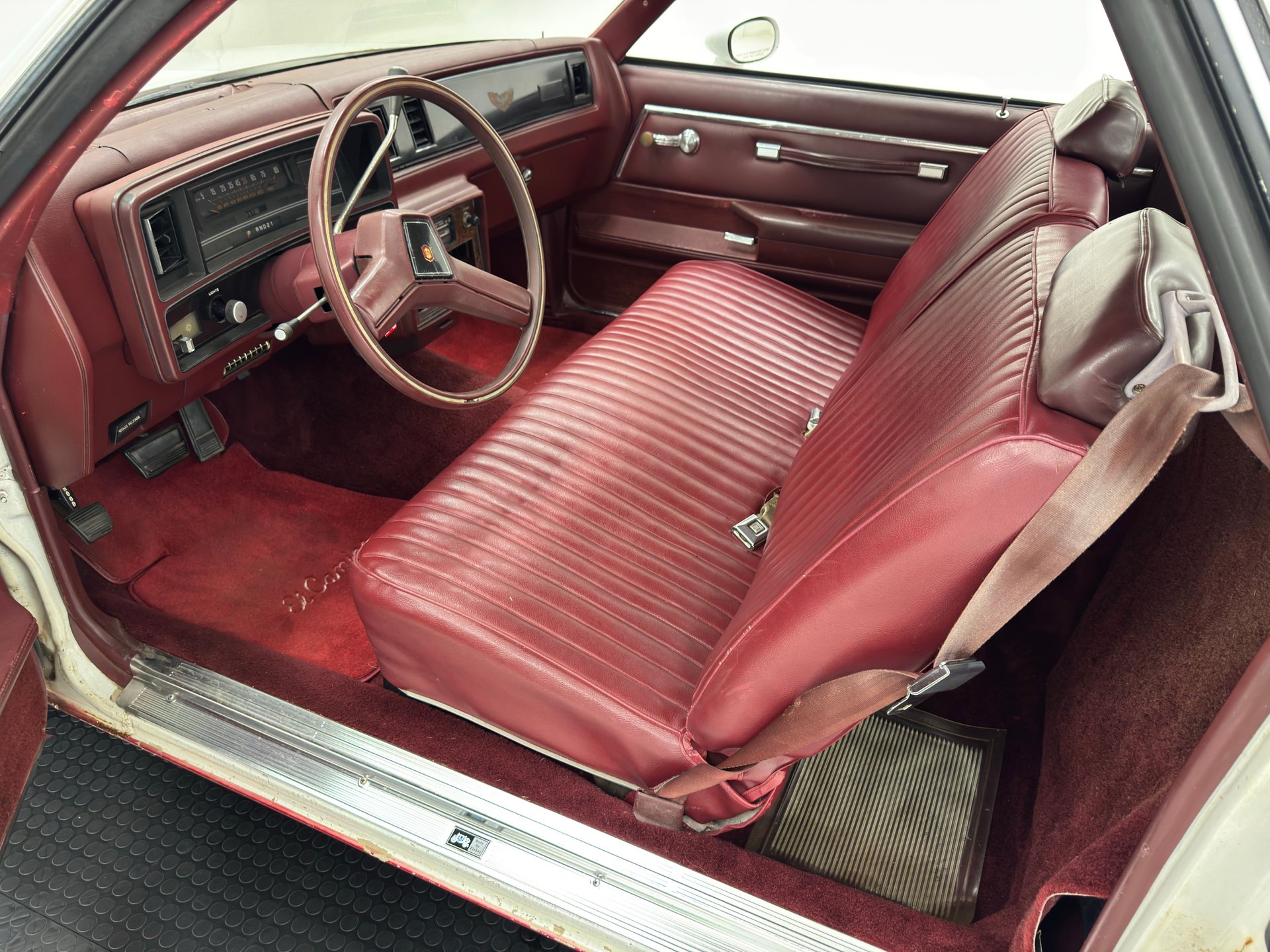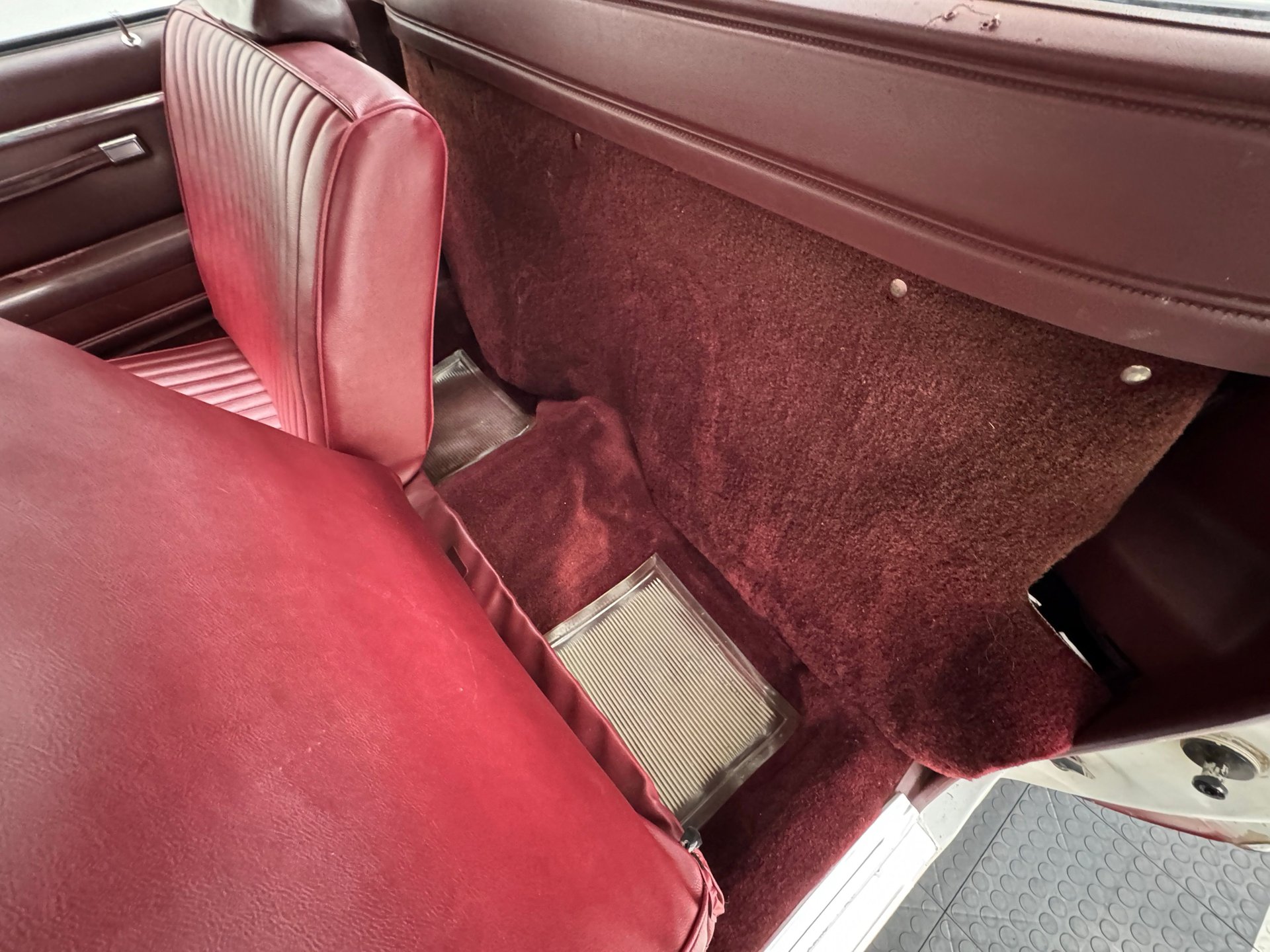 The red vinyl door panels show some patina with scratches, loose inserts, and missing knobs but the bench seat is in very good shape with just a few checks in the side piping. The original steering wheel fronts the standard dash, a horizontal speedometer, gas gauge, odometer, and gear indicator and that's about it other than indicator lights. The center stack has an A/C panel although the A/C is no longer in the car, and a Delco AM/FM radio over red carpet in good shape, protected by El Camino embroidered mats. Up above a few dimples appear in an otherwise clean headliner and the visors look perfect. There is no radio in the car.