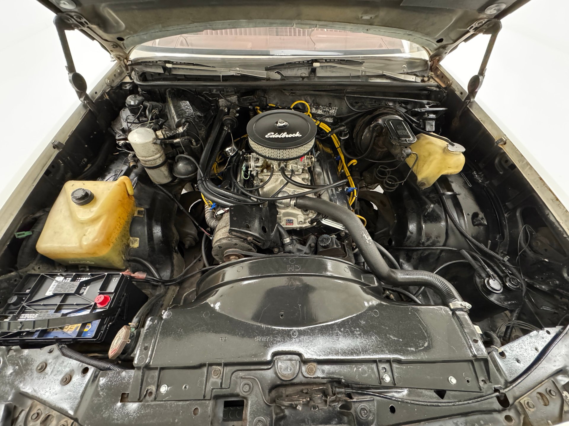 Here we have a 350ci V8, fitting with no problem at all and topped by an Edelbrock 4-barrel over and Edelbrock intake manifold. It's backed by a TH350 3-speed automatic sending power to the 10 bolt axle out back. Headers are heat wrapped and yellow spark wires add some color to the driver quality bay. Our consignor states a new battery and starter have been added under his tenure.