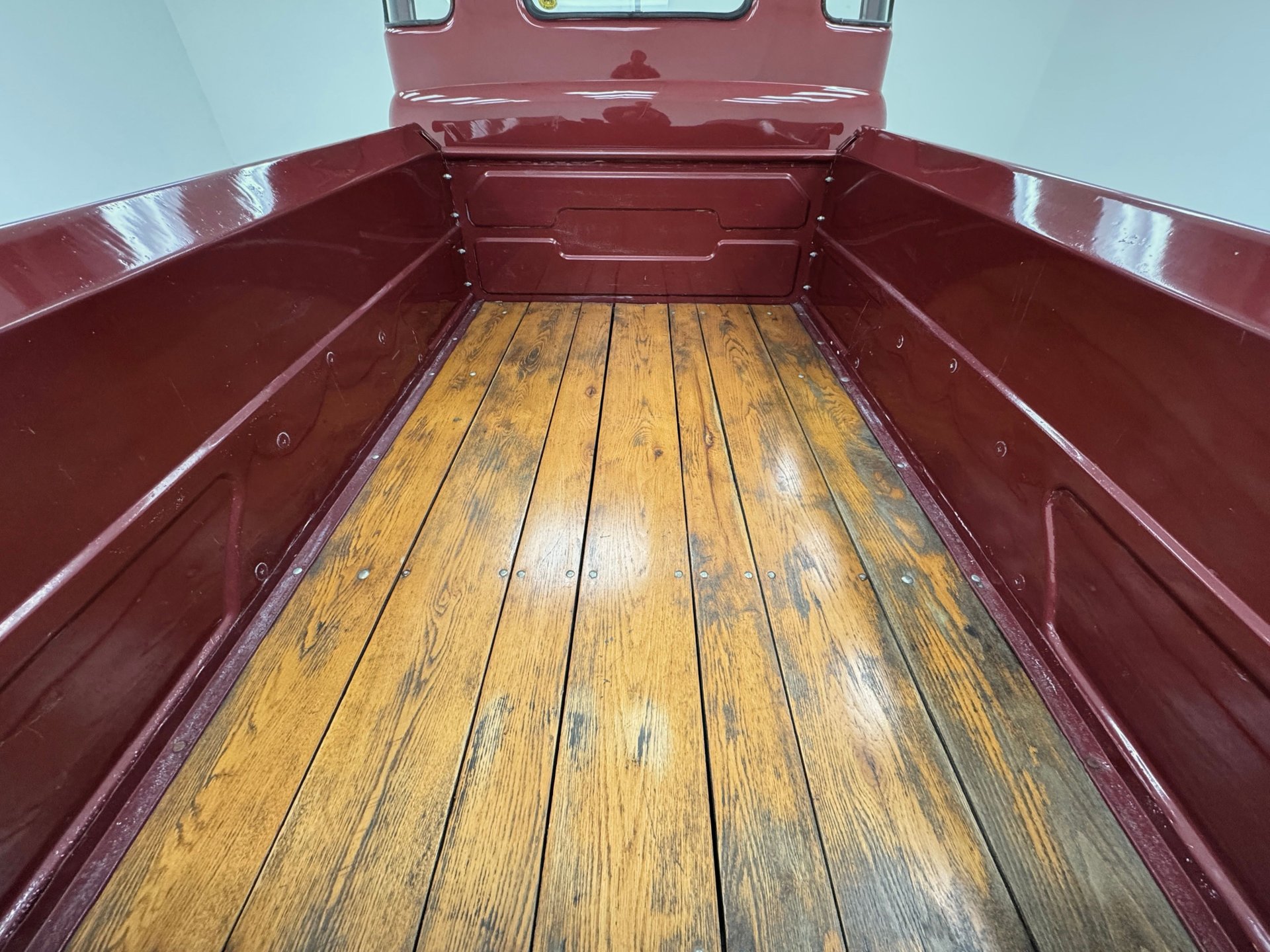 The Dark Red paint is the perfect background for the gray painted grille and bumper up front while chrome headlight rings and the hood ornament, an epic, stylized ram in a bullet-like charge, both shine bright up front. In profile, its unique configuration is almost a blend of two different trucks with a round “pilot house” cab and a bed full of right angles and embossed side panels that create visual interest as well as strength. The front's fenders are flat topped giving the truck a distinct look amongst trucks of the era while 15-inch American Racing Torque Thrust wheels, black with silver lips, bring the truck into the modern era with staggered size tires and a slightly raked stance. There are five windows in the cab but robust columns between them and in the bed, patina presents in the planks. The metal work and paint are generally good with imperfections that include touches up chips and scratches and a few untouched scratches.