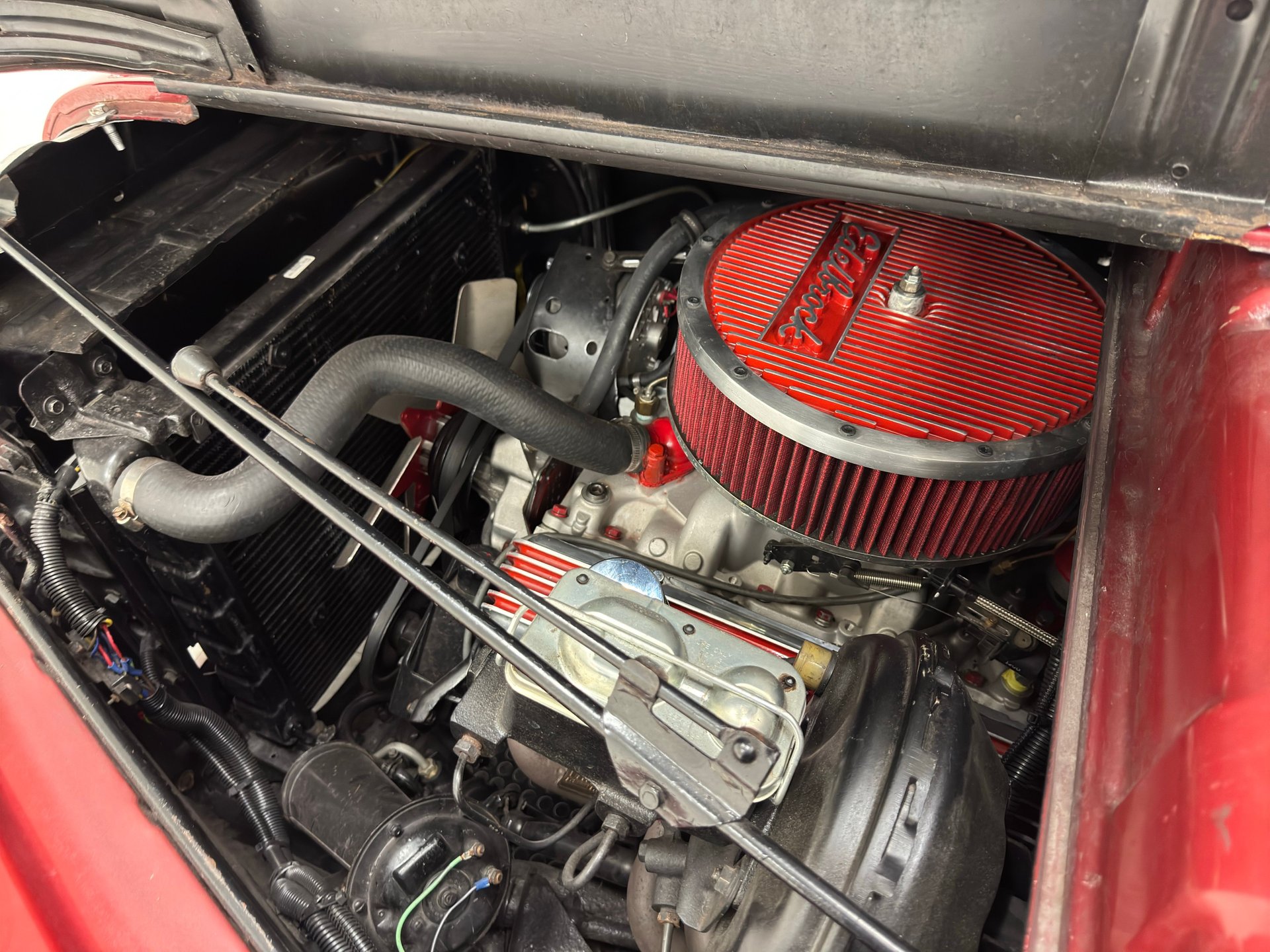 Lots of red accenting is found on the engine, a 350ci V8 our consignor states was rebuilt and mated with a set of Flotek 180cc aluminum heads and an Edelbrock 600cfm 4-barrel carburetor. For the transfer of power we have a 700R4 4-speed transmission sending power to the 10 bolt axle with 3.08 gears. Headers begin the exhale process just below the Edelbrock valve covers painted red between the ribs. Power brakes are accounted for and are present as front discs and rear drums.
