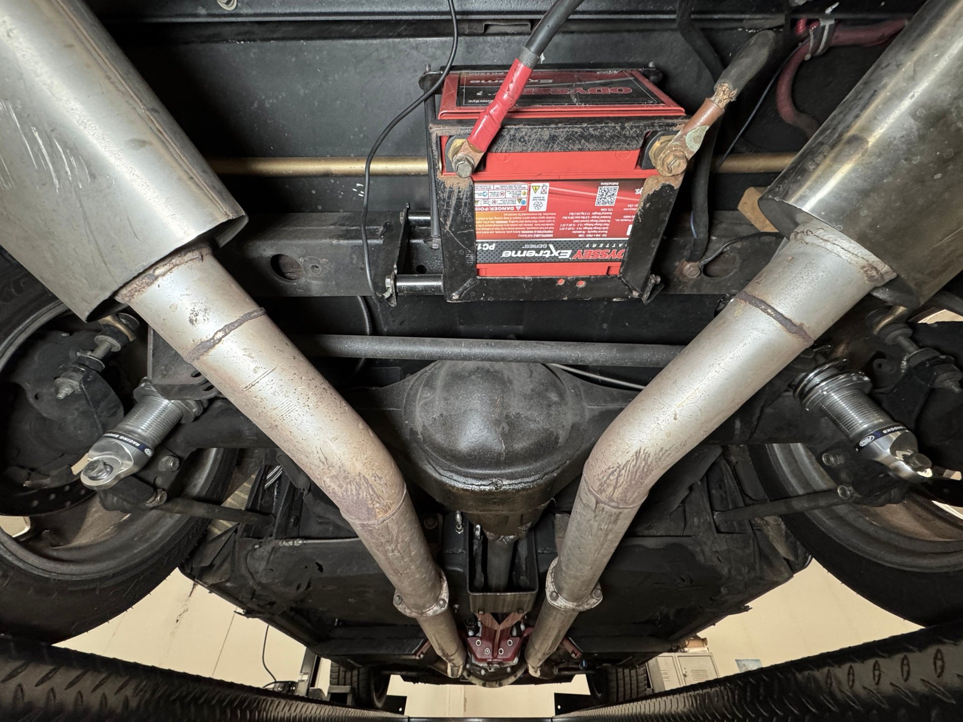 Clean and dry underneath with some added bracing to the chassis and zero surface rust nor errant fluids to note. Dual exhaust flow through Borla mufflers routed to exit through the rear valance and disc brakes are found on all four wheels and Wilwood is employed to slow the ponies down. Suspension includes coil over sin front and a 3 link with coil overs in back. An Aeromotive racing fuel pump is noted underneath along with a bottom mounted battery.