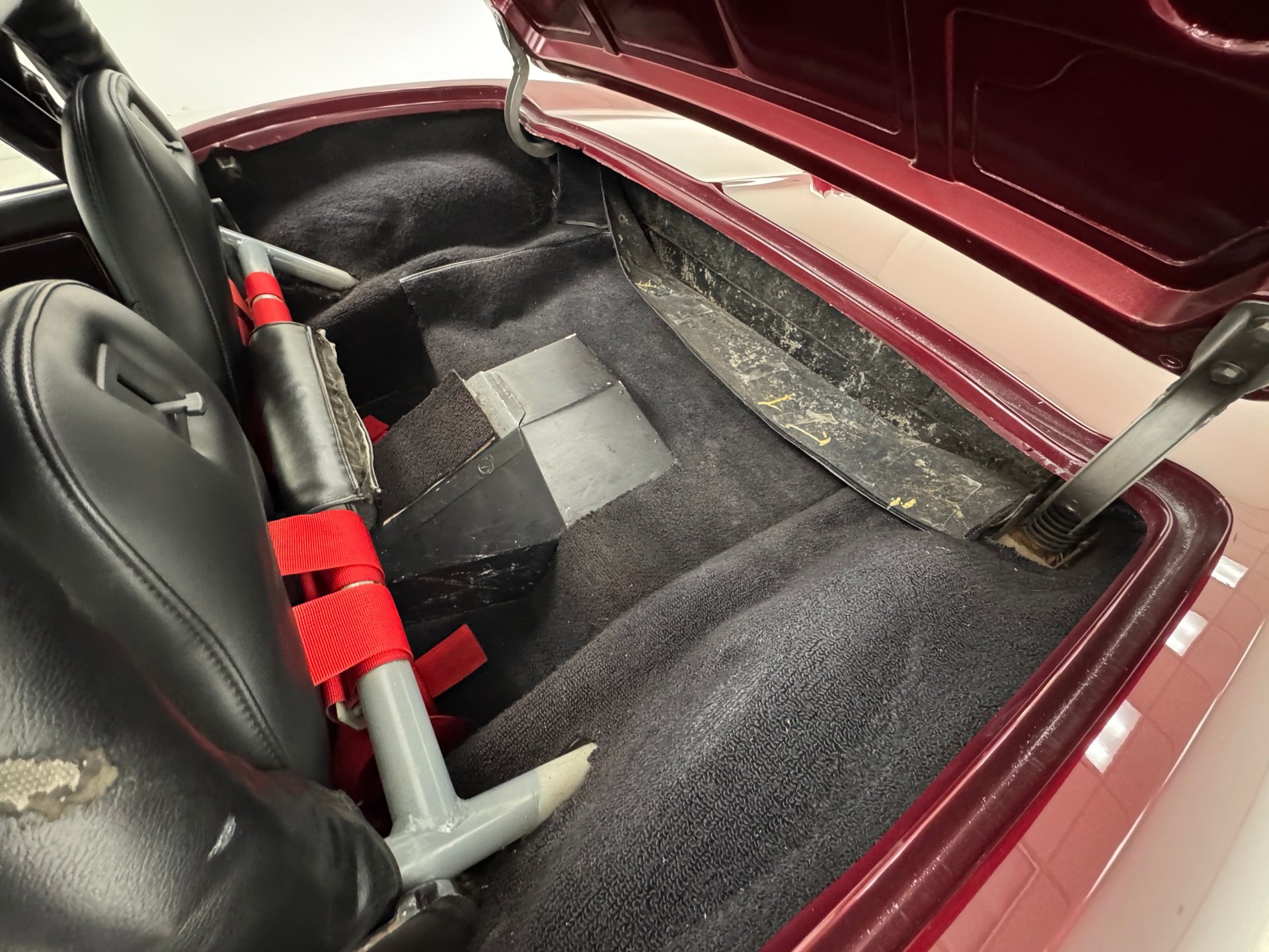 If the color looks familiar, you may be a true Corvette fan as the selection here is Anniversary Red from 2003 and the hood stinger is accentuated with custom black cherry paint and both have subtle black tones that create a great blend with the canvas soft top and of course, the low profile tires. The depth of the fender gills create dark shadows for even more congruence and the 17-inch Billet Specialties wheels simply pop, whether viewed in person or in photographs. The split rear bumper perfectly reflects the dual tail lights above them, and frames the license plate under a wide reverse light. The body work is great on the can and so is the paint with a few imperfections noted as some chips on the door edge, some touched up, a few stress cracks, some scratches, some rock chip spray behind the rear wheels, and some curb rash.