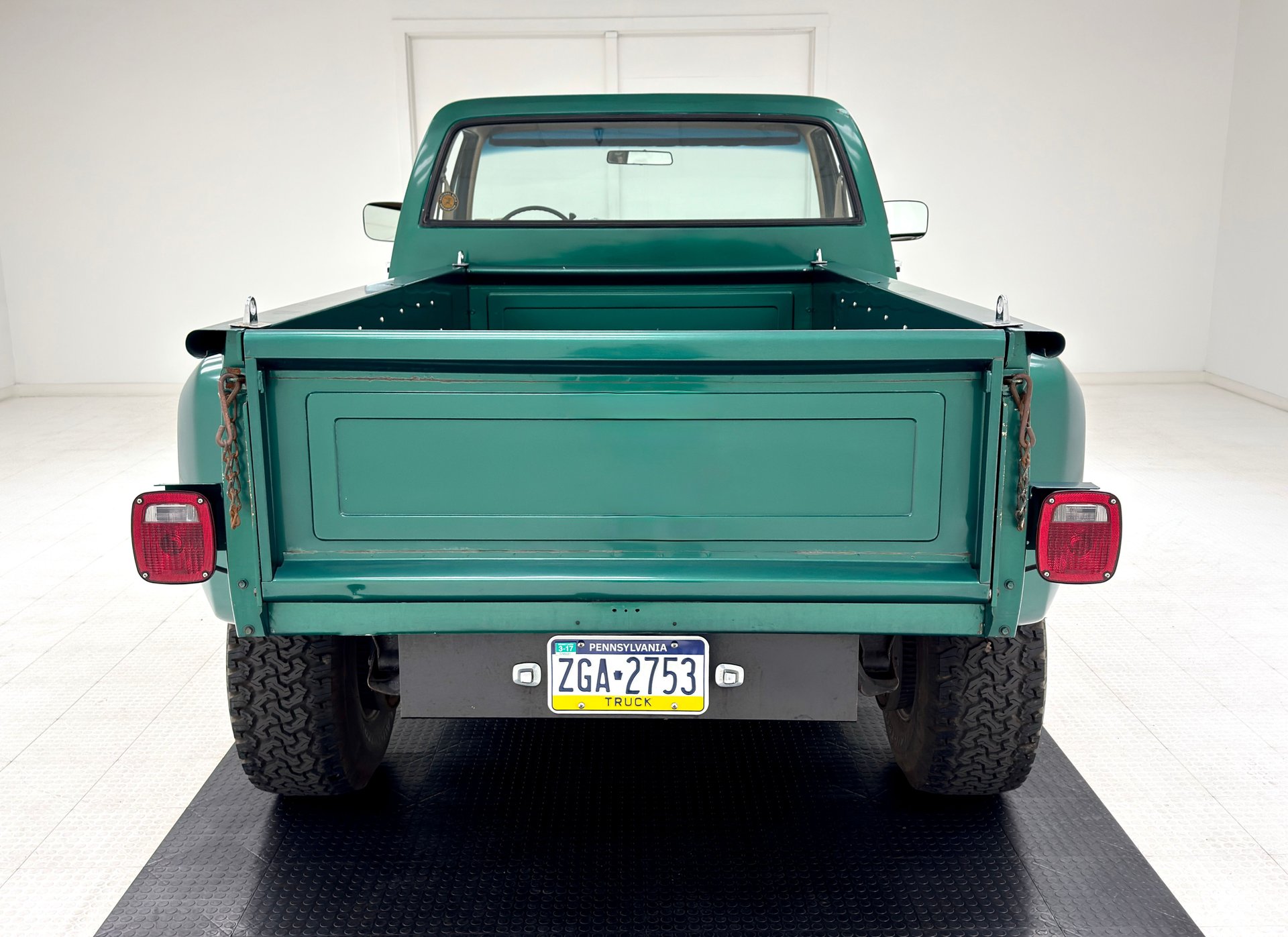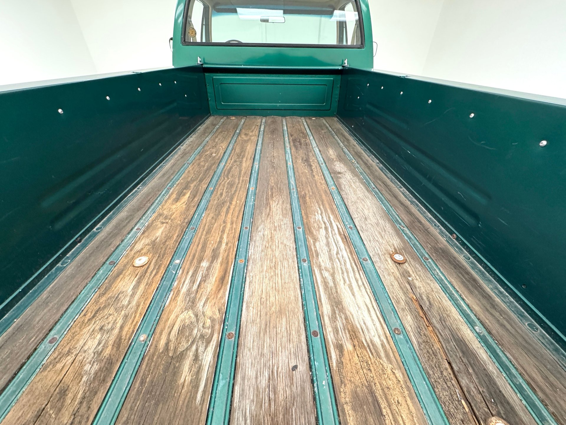The single stage green paint is appropriate satin like in finish and looking period correct and clean on this debadged truck. Even the tailgate is blank with the manufacturer designation not present, not even a bowtie! Up front, a black grille adds some individuality to the truck over the standard chrome bumper and in back, the bumper has been deleted and in its place, a smooth black panel holding the license plate and its lights. A solid window looks out over the wooden bed with nice wear on the planks which alternate with green bed rails, and the green paint on the sidewalls is in good condition. 16.5-inch aluminum slot wheels are deep and carry 33x12.50R15LT tires with cracking sidewalls that confirm their 32 year old age. Imperfections include some chipped paint on the bed near the step, and cracking filler on the bottom edge.