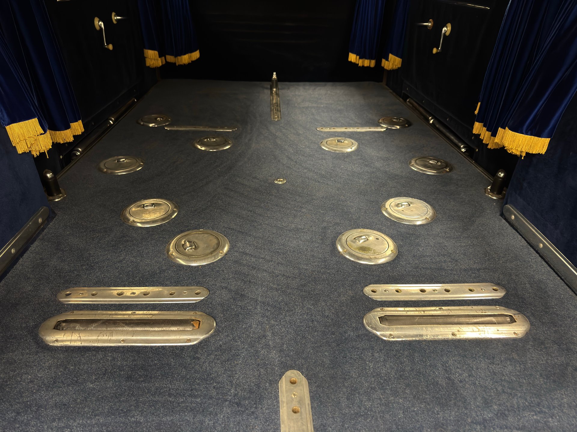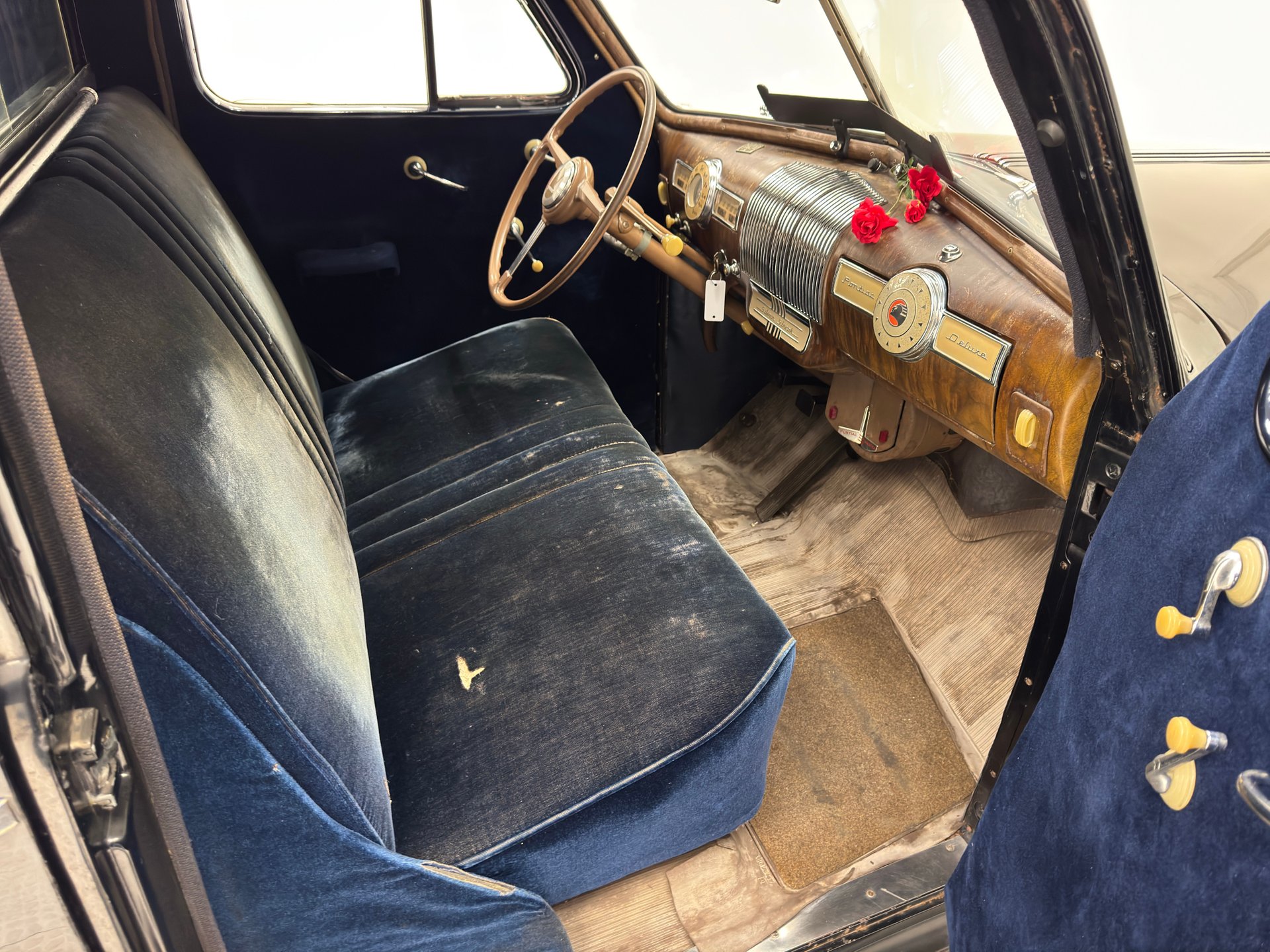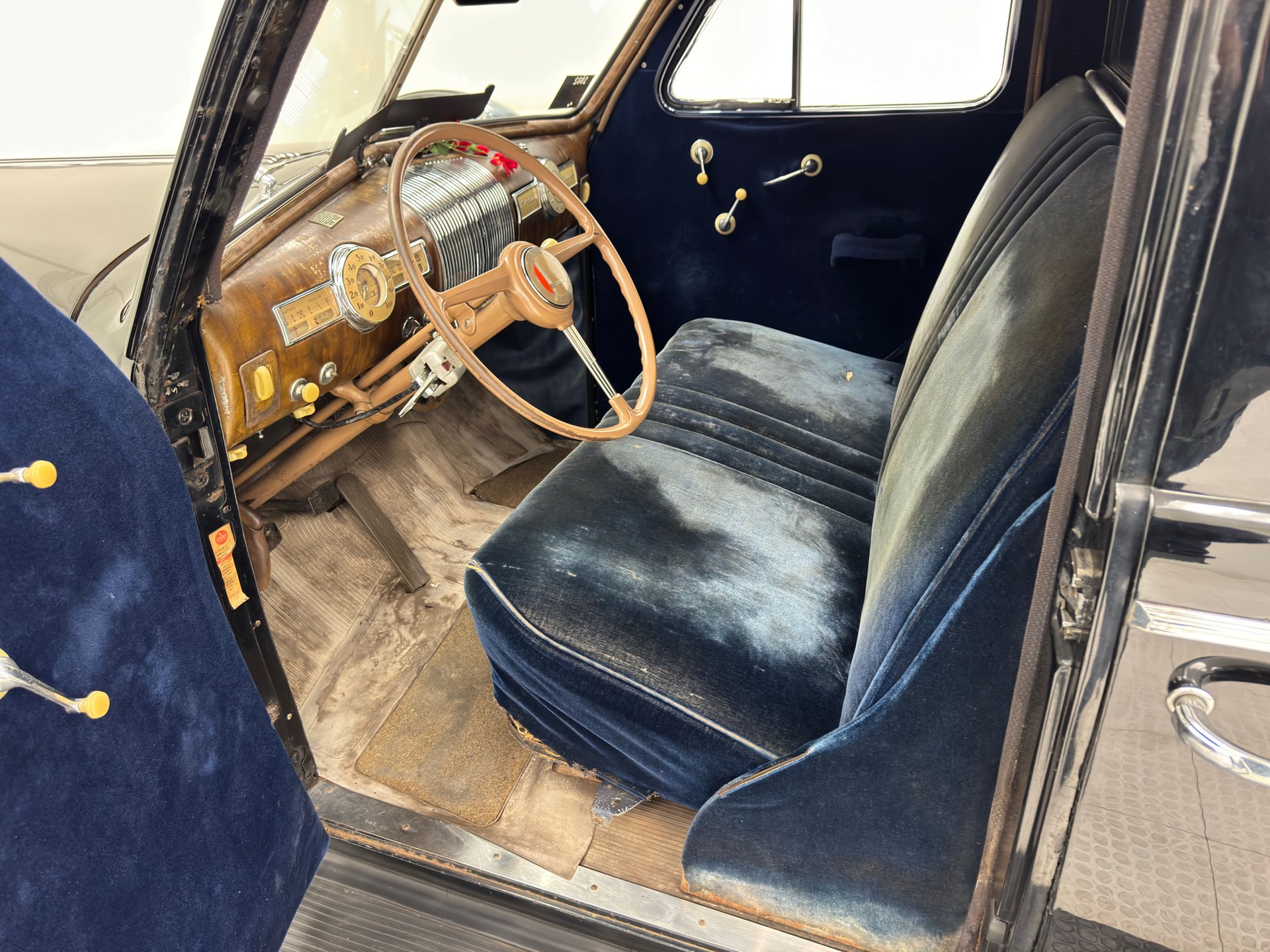 As it was back in the day, this hearse is solid Black and the proportions are like no other Pontiac with a rising roofline over long windows and a tall body, more than 15 hands in equine terms. The rear door cants forward perhaps to allow easier access to the floor and the door has a robust handle under a modest window. The bumper displays an early Pontiac badge and the tail lights are impossibly small for such a big car, but that was the norm in 1940. A spare tire cover is embedded into the front fender, visually interrupting the side stainless trim piece that goes from the nose and all the way to the back where it follows a descending body line. Trim in the front is an elegant, five part strip that extends across the hood, capping stunning emblem, nose piece and grille, with yellow fog lights introducing some color to the exterior. There is some checking in the paint and a rust spot on a door, but otherwise paint and trim are in very good shape.