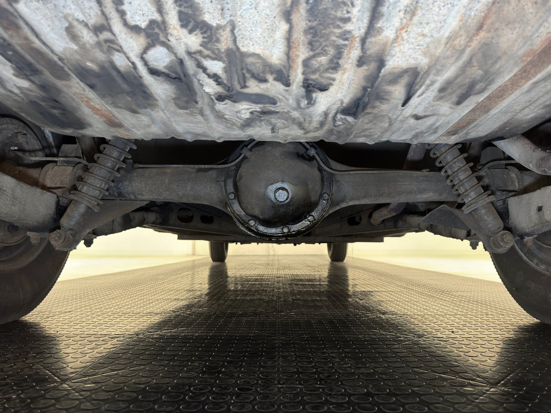 Driver quality under here with residual oil about, typical road grime, but minimal surface rust and the visible coachwork is in good condition. Drum brakes are supplied to all four wheels and suspension consists of coil springs in front and leaf springs in the back. A single exhaust flows through a stock style muffler and exits under the bumper.