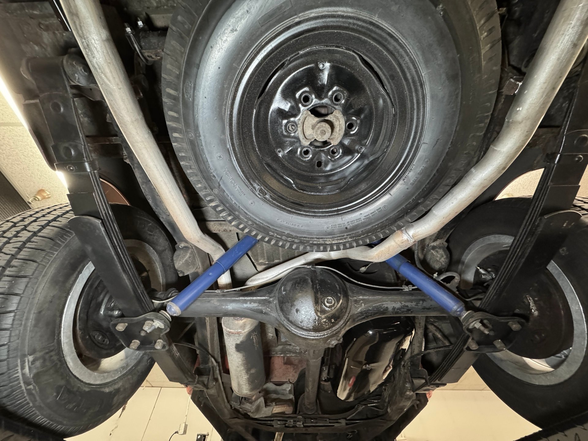 Super clean underneath with minimal surface rust and some residual about but no active leaks. Drum brakes are at all four wheels and benefit from newer wheel cylinders, hoses, and lining while the front end receives newer steering tie rod ends and sway bar bushings to complement the torsion bar suspension in front and fantastically clean leaf springs in back. The single exhaust enters a stock style muffler, then splits to become two tailpipes with chrome tips out back.