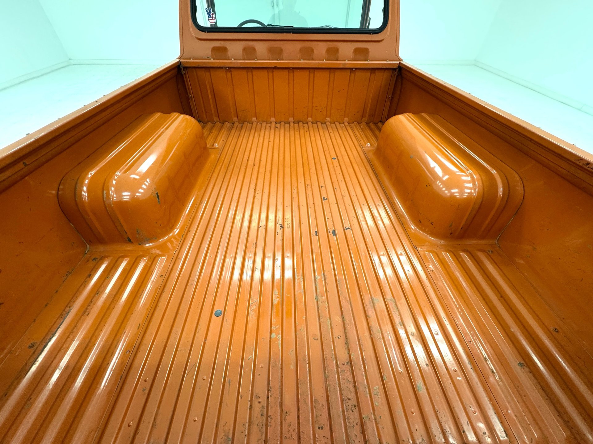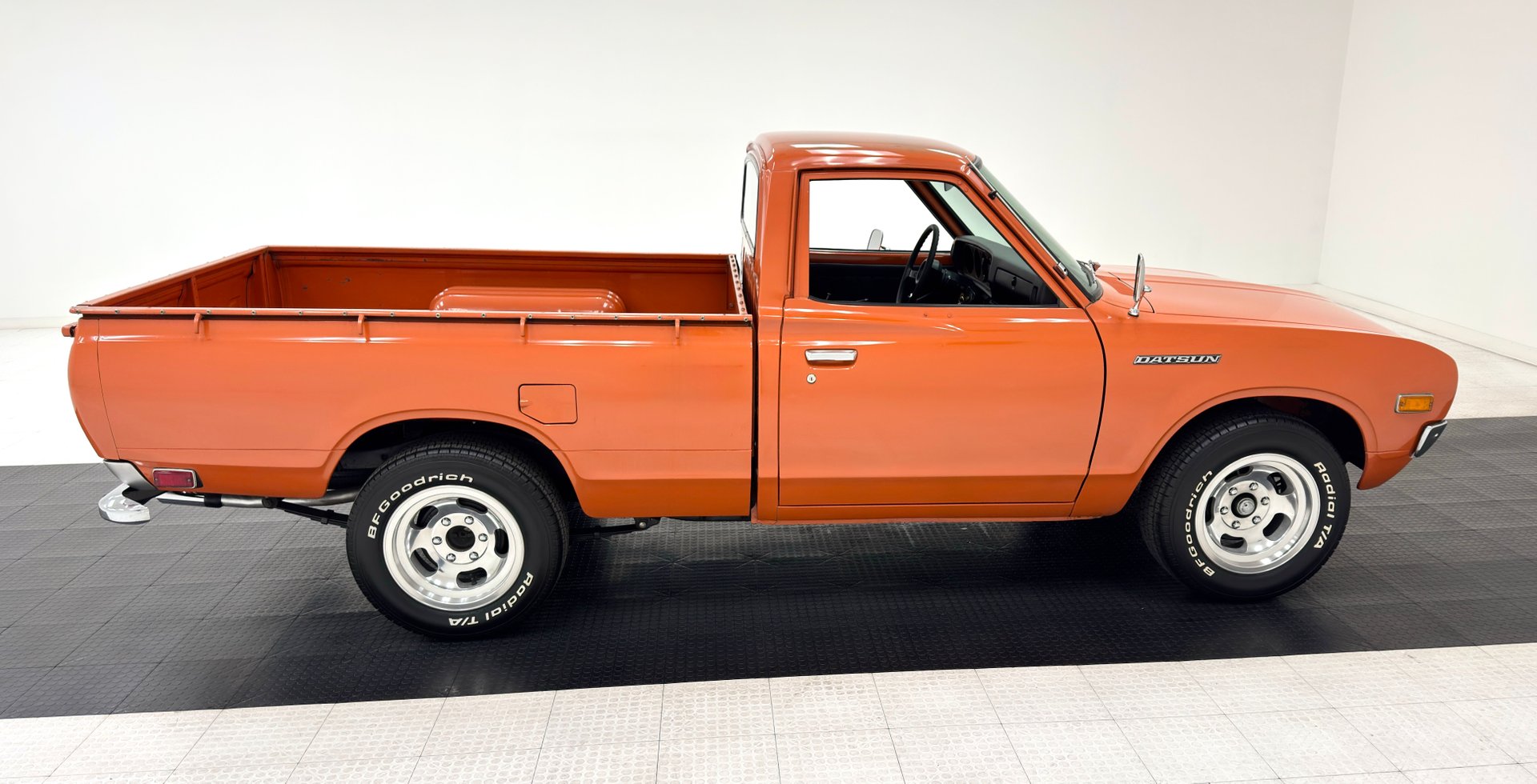 Fantastically clean coverage by Sunset Orange paint sets this truck ablaze in period style and its standard bed is adorned with tie down hooks welded to the side and color matched to the body. The ends were distinct, blending the petite Japanese styling of the grille and dual headlights with the low tail lights in their own bezels above the diminutive split chrome rear bumper. With some non offensive patina, the white lettering on the tailgate is faded in spots, but DATSUN is clearly expressed on the stamped panel with two side latches rather a central lever. 15-inch Aluminum Slot which have been refurbished and our consignor states are from Japan, wear 215/65R15 tires with a mid 2022 date code and add a touch of sportiness to this small truck. The bed shows some use but the rest of the exterior is in great shape and we do not note any glaring imperfections.