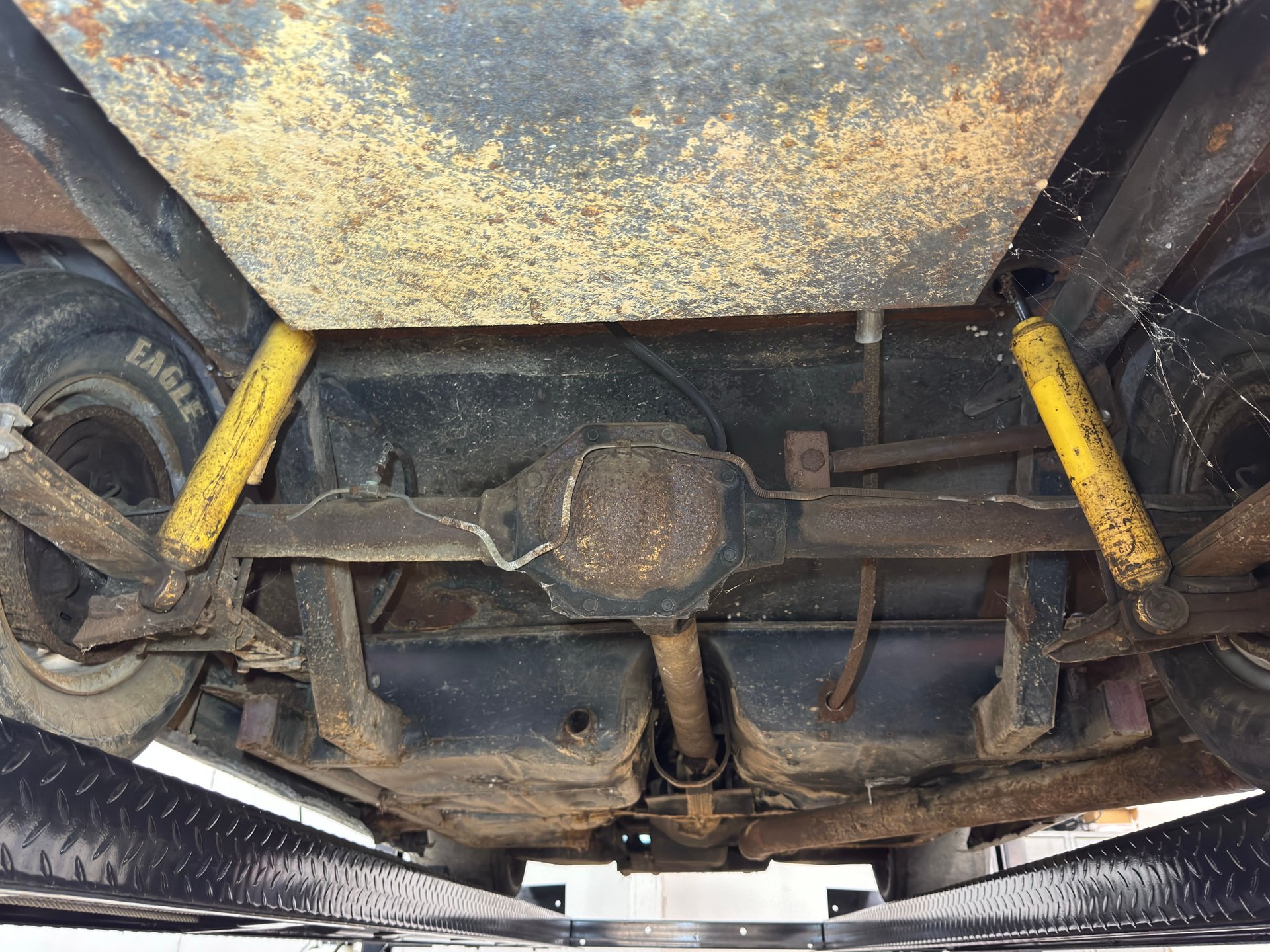 Lots of surface rust, corrosion and mud on the bottom but everything seems to be intact. Disc brakes are on front and drums in back while the single exhaust is not impeded by a muffler and exits to the side. Suspension consists of coil springs in front and leaf springs in the back.