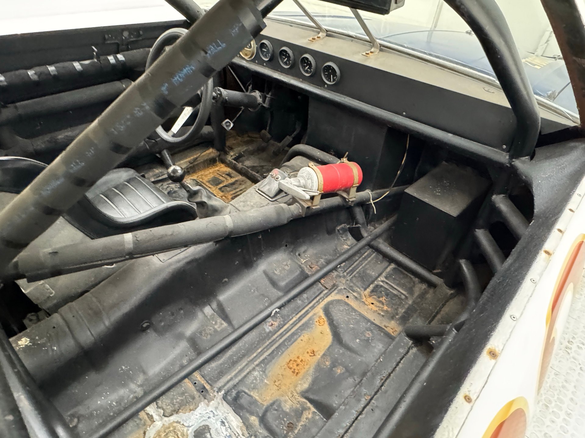 Pure race mode on the inside with a full roll cage, bare metal floors, a single bucket seat, and a padded 3 spoke steering wheel. The dash board is basic with a Holman Moody toggle panel and five gauges. The shifter is on the transmission hump and retains its boot which keeps dirt out of the linkage. Surface rust is noted in the footwells and on the gas tank in back while the rest presents with fitting patina.