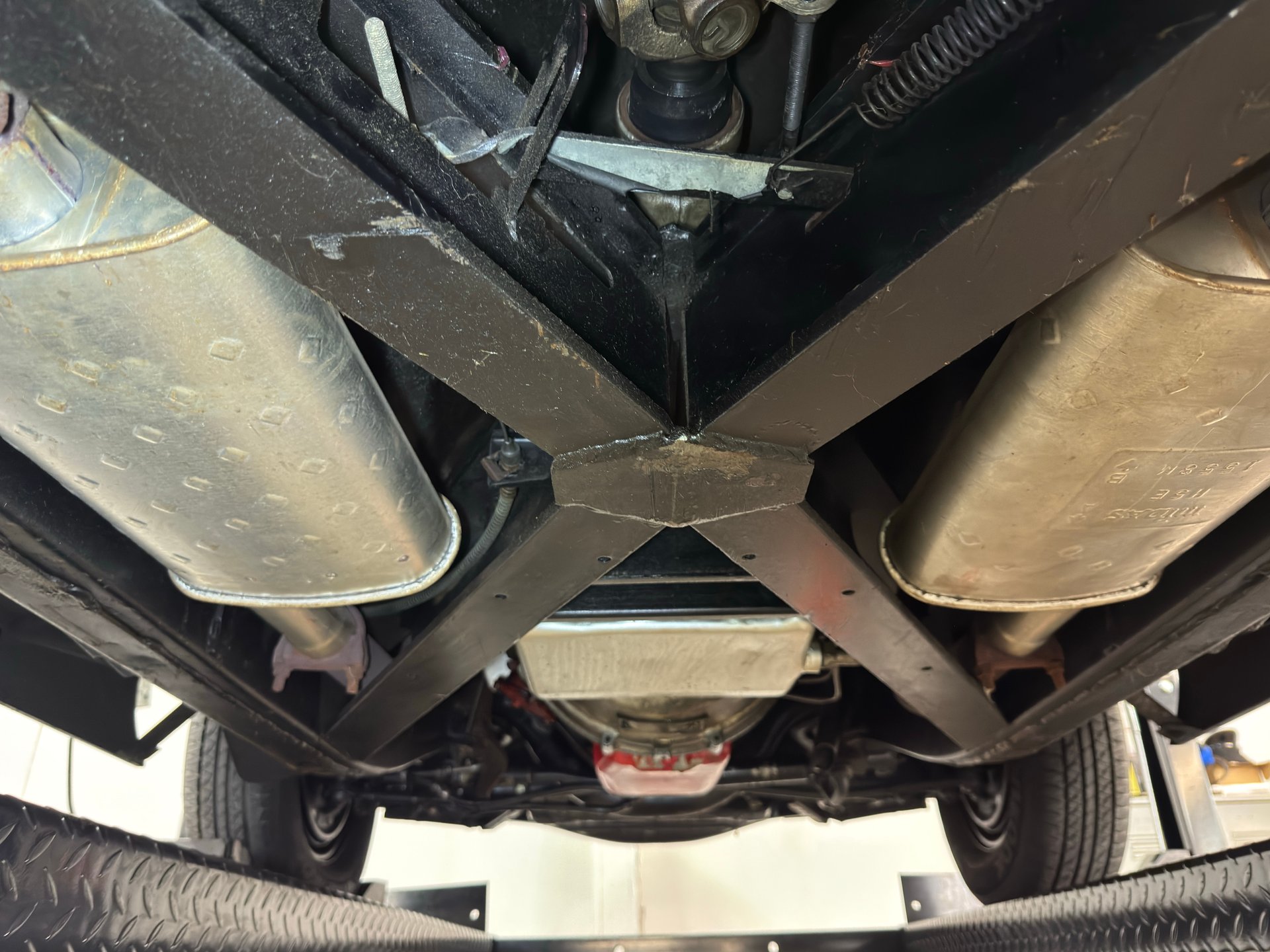 Overall clean underneath with surface rust reserved for the exhaust, the dual system that runs through clean stock style mufflers on their way to the rear bumper. The gas tank looks fairly fresh too and power drum brakes are found on all four wheels. Suspension consists of coil springs in front and leaf springs in back. We note some oil on the rear differential and a few drops on the front.
