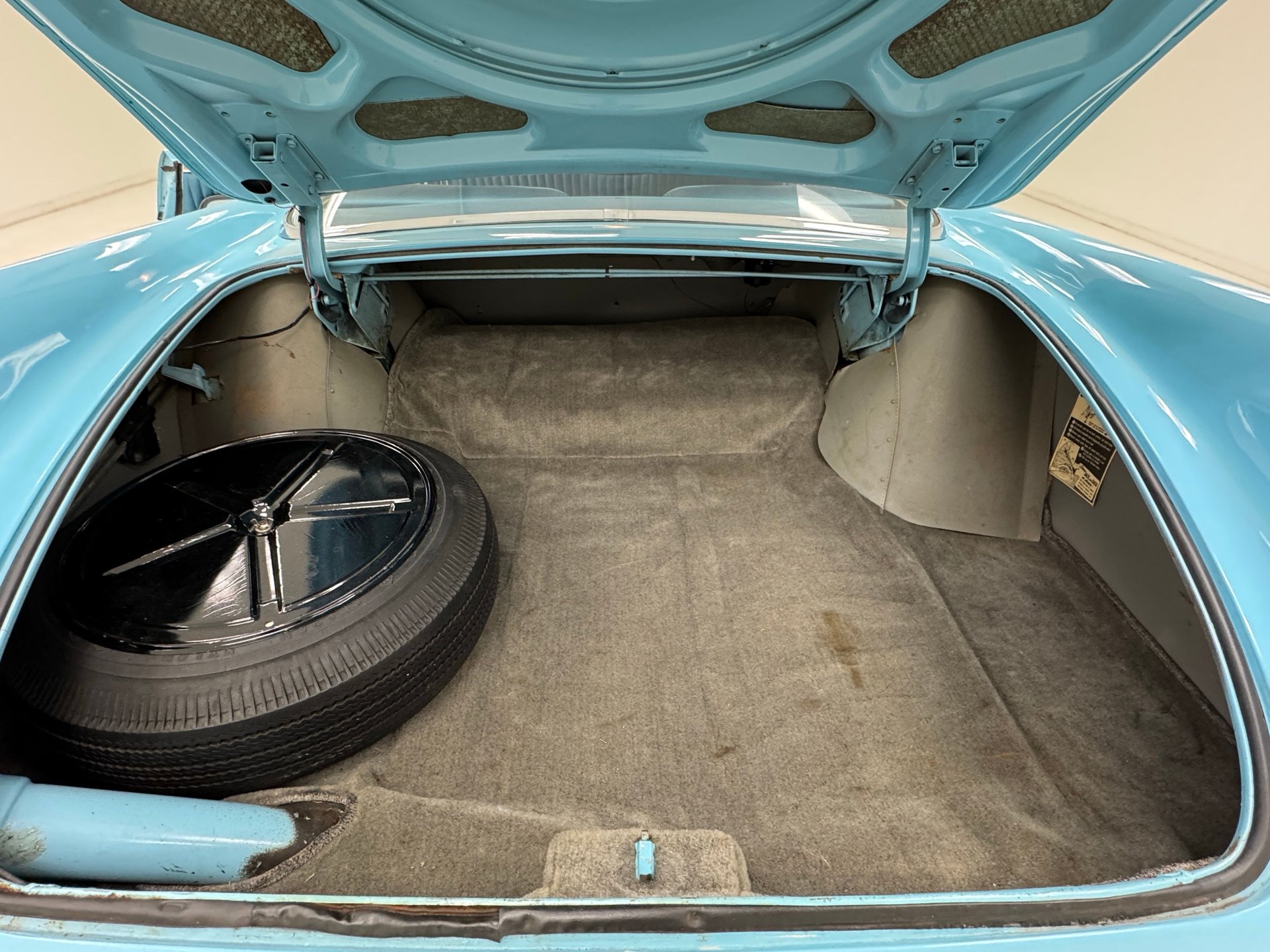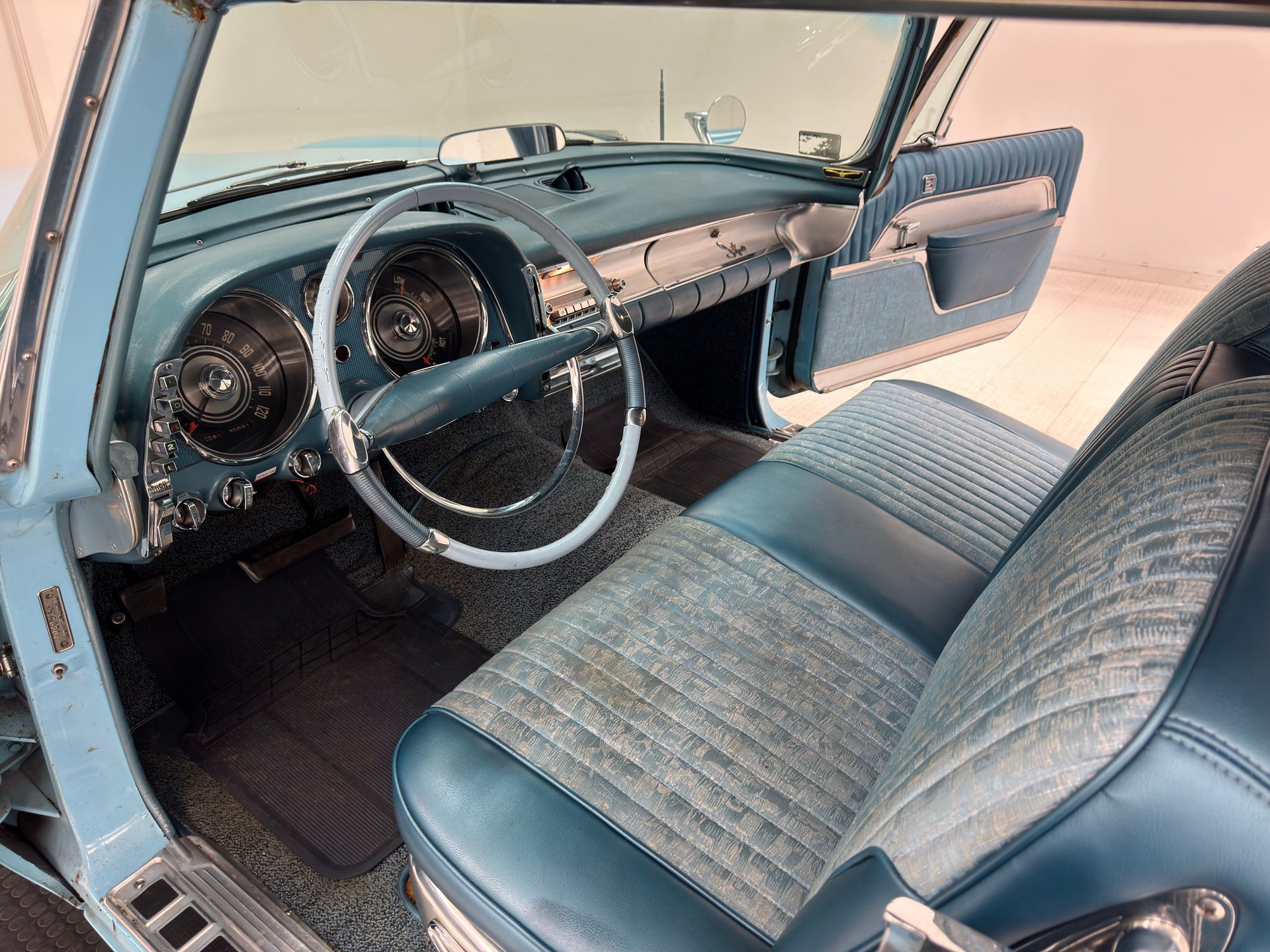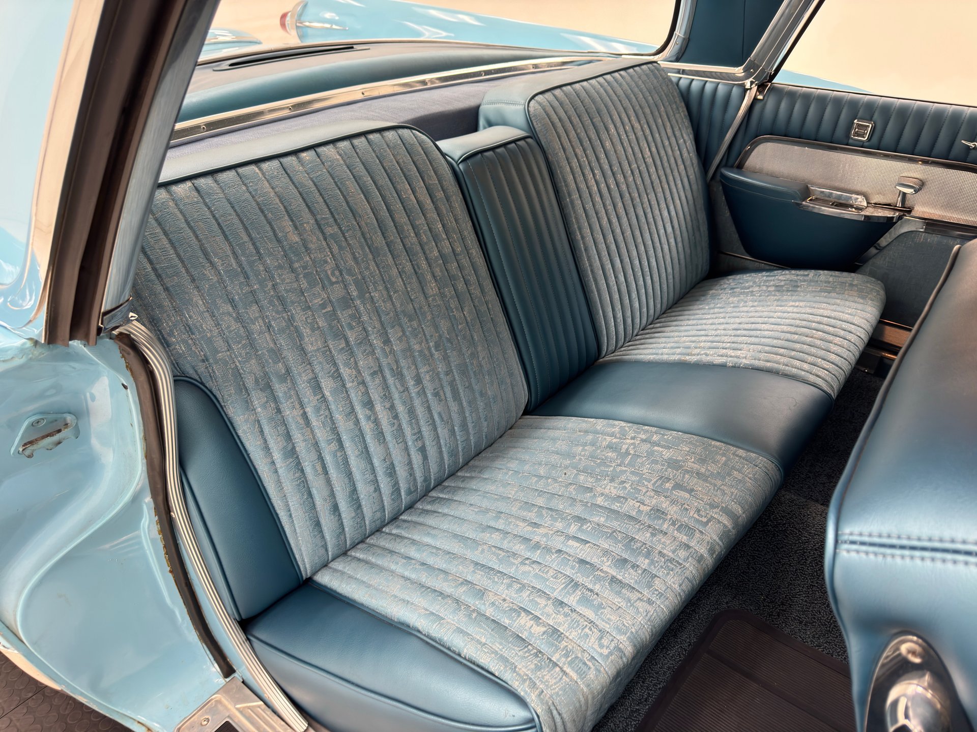 Long it is, 224 inches in all, and that's just part of the dramatic appeal. It's difficult to decide where to look first. Is the browed dual headlights up front, the picnic basket type C-pillar, the floating roof, or the over the top fins and tail lights? Let's start out back where there's more drama than anywhere else, those tall fins with the taillight somewhat reminiscent of the earliest Corvettes, only with more flair! The decklid is stamped with a Continental kit with a hubcap like embellishment. But it doesn't stop there as the bumper has a ribbed pattern that leads to the embedded marker lights, because a straight bumper simply would not have been good enough for this beauty bathed in Horizon Blue. Cloud White is a good name for the roof color and it's a nice complement to the white wall tires on 14-inch wheels. Overall, the exterior is in great shape with some minor blistering on lower areas.