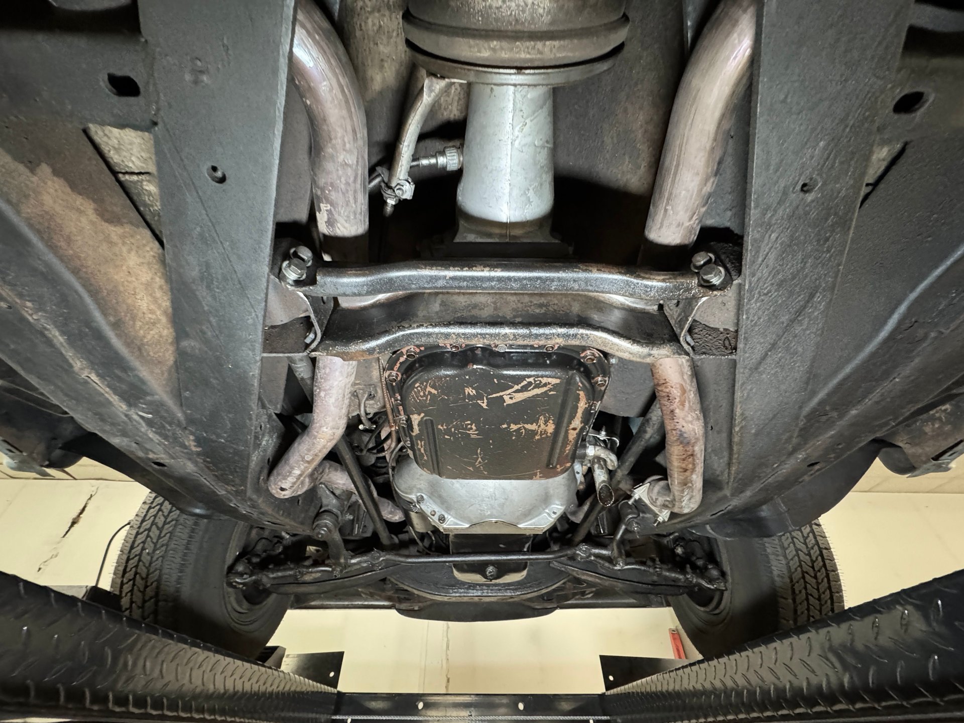 Clean underneath with some typical surface rust and a touch of dampness on the rear differential and axle. The dual exhaust takes in 4 stock style mufflers and threads the X-frame on its way to an unceremonious exit behind the rear bumper. Power drum brakes are on all four wheels and suspension consists of torsion bars up front and leaf springs in back.
