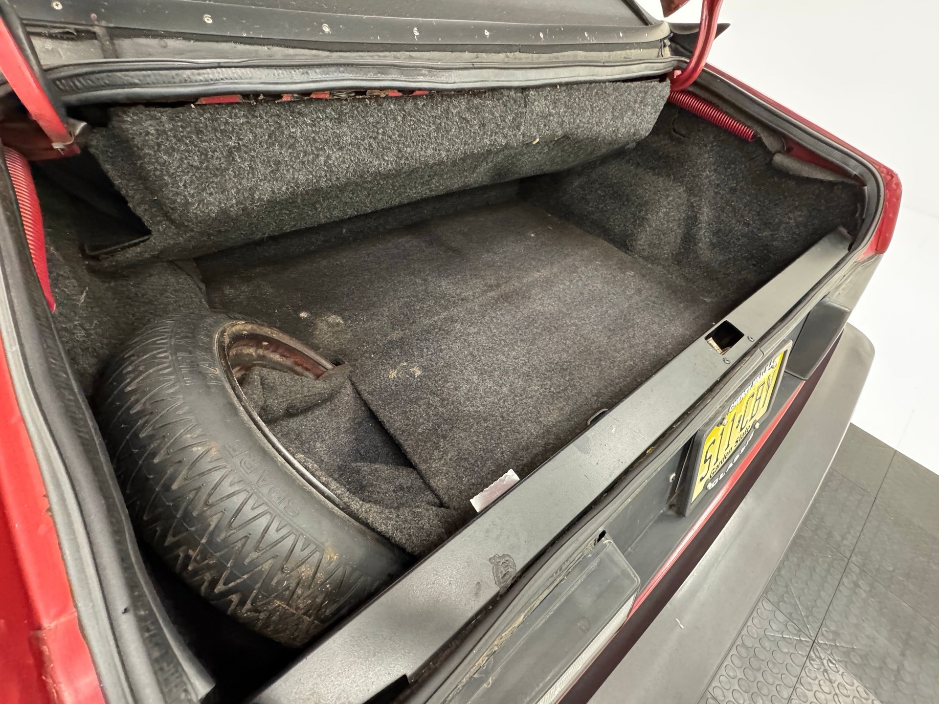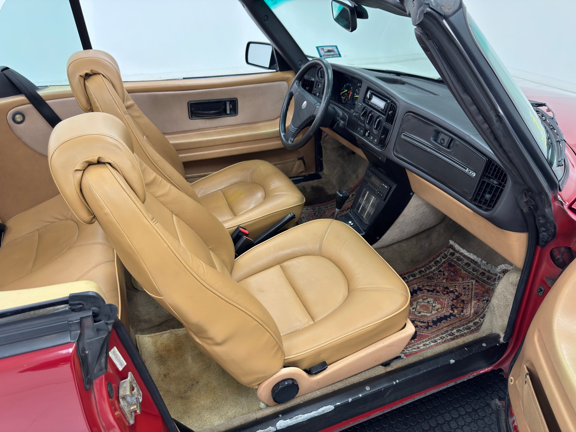 This one comes in a desirable flavor, two stage Cherry Red with black canvas top that shortens the fastback design of the coupe and accentuates the line with a black rubber wing, the bookends of which wrap around the rear of the cabin. Black plays an important role in design and contrast here with a bold side molding that visually connects the extended, wrap-around black bumpers, a pinstripe that runs under a character line, and the darkened latch panel at the base of the sloping deck lid. Up front, pure Saab with the distinctive grille, composite headlights, two color markers, and foglights for those misty Swedish mornings. Overall, the exterior is in nice shape with imperfections noted as some love taps and scratches on the bumpers, rust through on the body at bumper line, cracked tail lens, fading emblems, curb rash and other blemishes on the wheels.