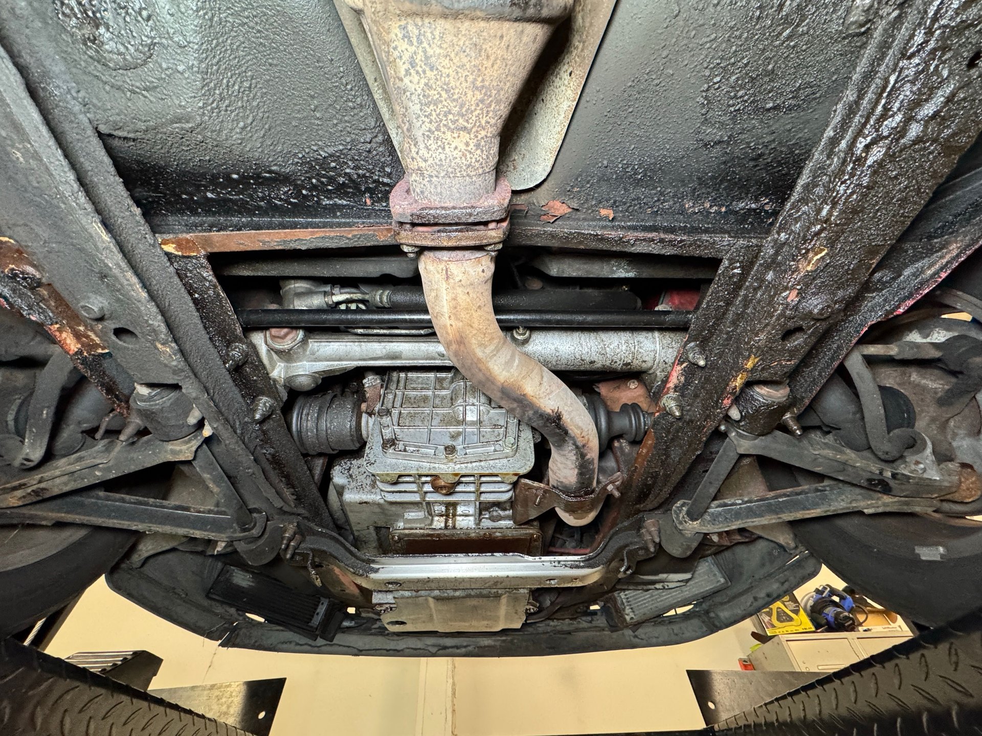 No surprises for a car with higher mileage, we observe some typical surface rust, oil on and around the engine bottom, clear knuckles, and intact belly pans. The 900 is equipped with four wheel power disc brakes and a single exhaust that travels a center tunnel to meet a stock style muffler before exiting via an oval pipe. Suspension consists of double wishbones up front and beam axle in the back.