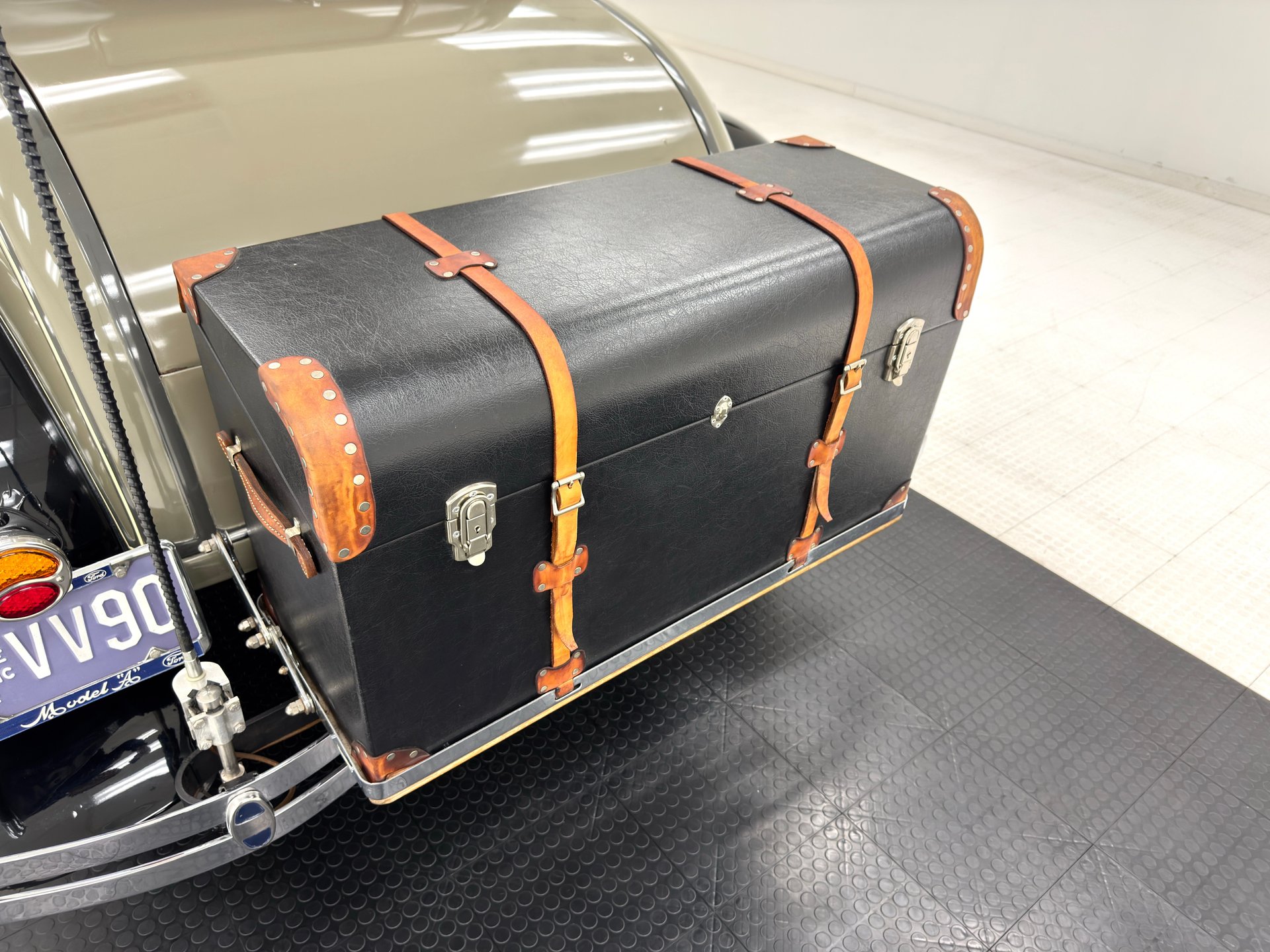French Gray paint coats the car in epic two tone fashion, here embellished by a cream pinstripe that runs over the rear slope and is a nice visual pick up with the yellow 19-inch wire wheels. Along with a winged motometer, the radiator's frame is polished metal which is matched in presentation by the straight bumper in front and the split bumpers in back. In typical fashion, the fenders and connecting running board are painted black providing a nice contrast to the earth tone of the car and allowing the white wall tires to really pop, visually that is. The trunk mounted out back is a nice touch with saddle leather straps and accents fitting perfectly on the fold down luggage rack. Moving in within 20 feet of the car reveals some imperfections that include cracking paint, a cracked fender, scuffs, scratches, chips, and crazing.