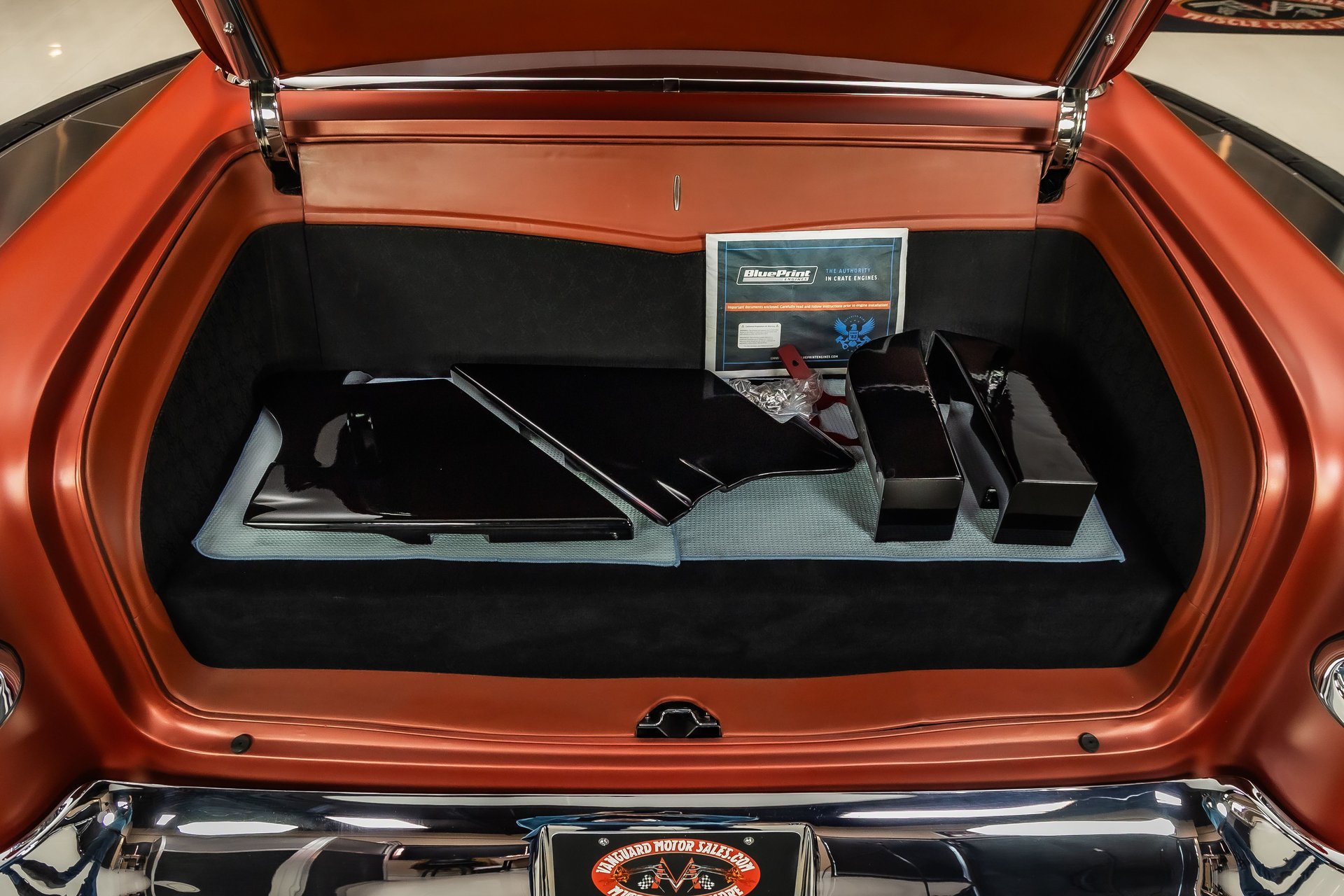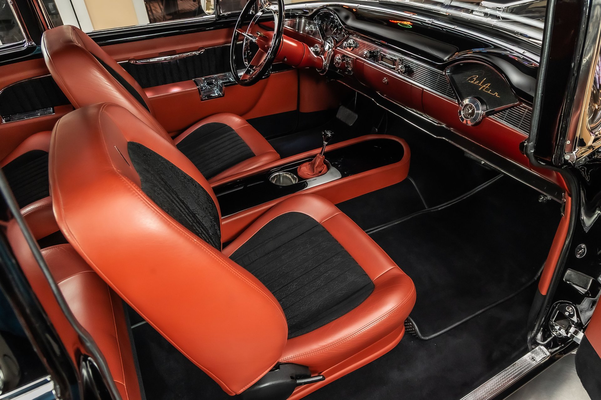 The interior of this Bel Air has been completely upgraded while still resembling a stock appearance! The interior features a bespoke design finished in Corbeau Bucket Seats with Black and Terracotta Leather over Black Accents and a Black Painted dash. Features include a Custom center console with a Lokar shifter and Cupholders, HVAC Controls, Factory Radio, New Stock Appearing Gauges, Custom Door Panels, Custom Headliner and New Factory Style Steering Wheel!