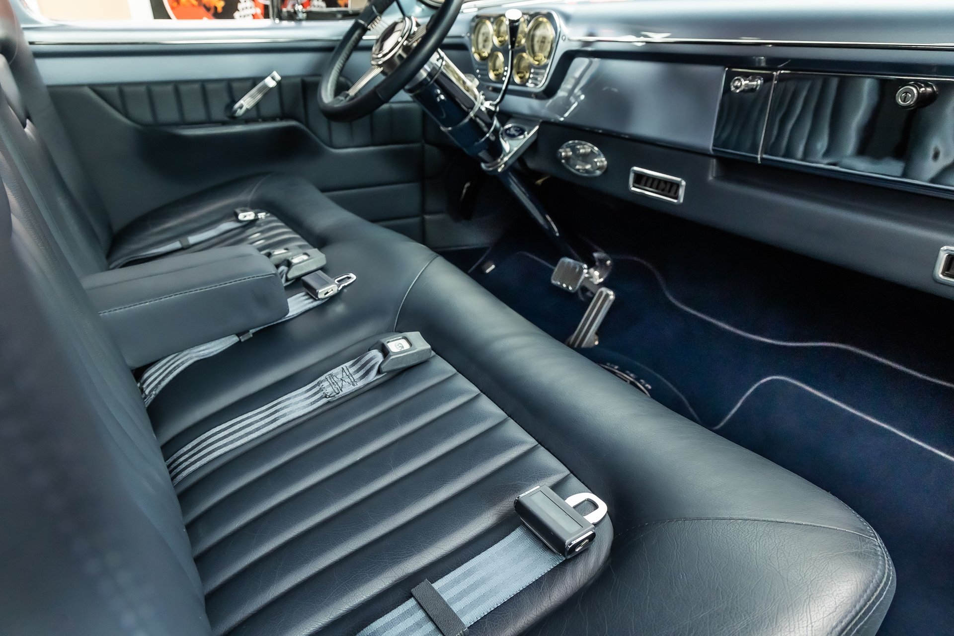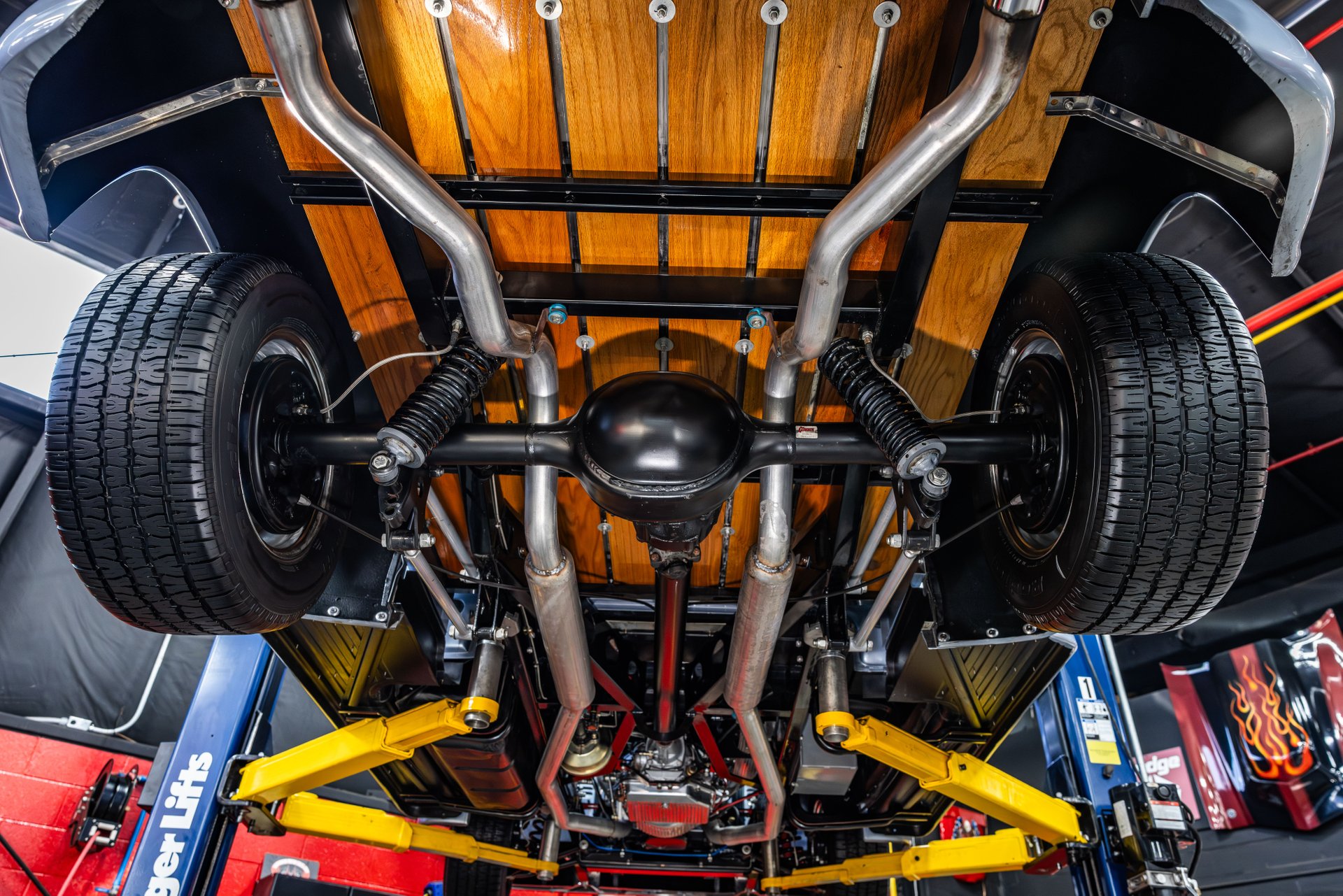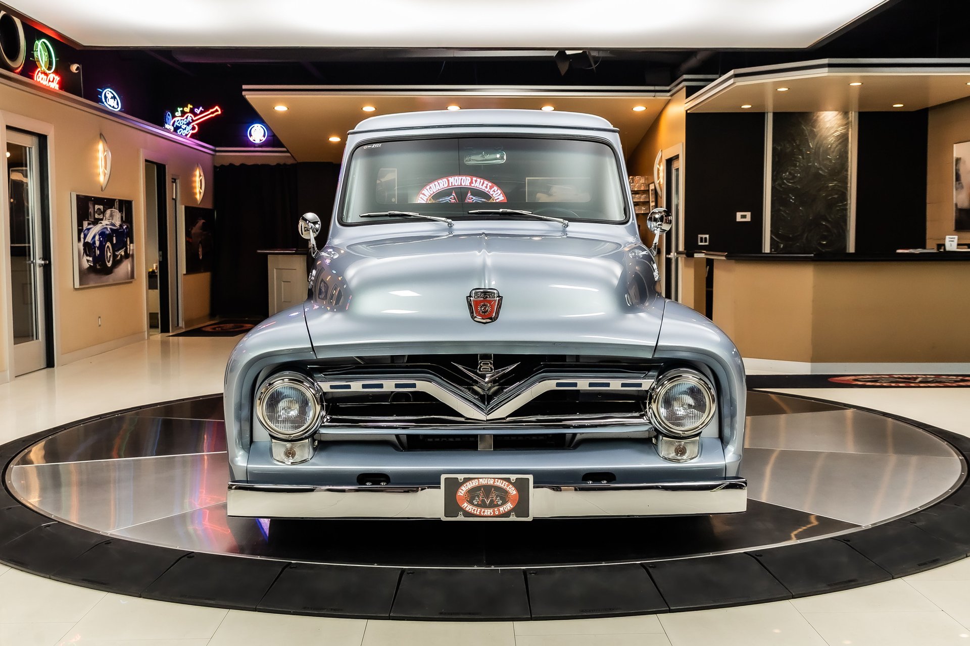 Inside, the interior of this 1955 F100 is Completely Restored and Upgraded! Take a look inside to see the Custom Leather Bench Seat, Blue Carpeting, Custom Door Panels, Body Color Matched Dashboard, Custom Headliner, Banjo Steering Wheel, Tilt Steering Column and Upgraded Gauges! Underneath Features many Tasteful Upgrades Including, Mustang 2 Style Front Suspension, Custom Frame and Dual Exhaust with Glasspack Mufflers!