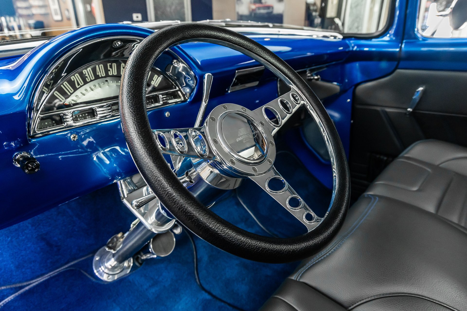 Inside, the interior of this 1956 F100 is Completely Restored and Upgraded! Take a look inside to see the Black Leather Bench Seat, Blue Carpeting, Custom Door Panels, Body Color Matched Dashboard, White Headliner, Custom Steering Wheel, Tilt Steering Column and Factory Style Gauges! Underneath Features many Tasteful Upgrades Including, Mustang 2 Style Front Suspension, Independent Rear Suspension and Dual Exhaust with Jet Coated Headers!