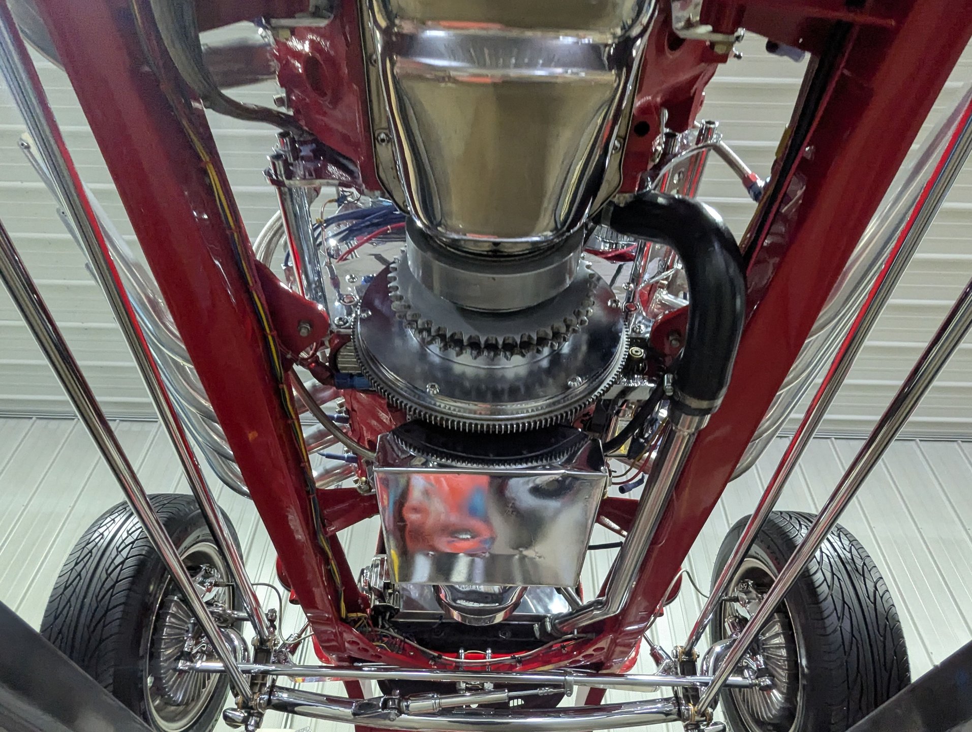 UNDERSIDE: It was built to a show standards underneath too. He took a Duece Factory frame and stretched it 36 inches, it was also boxed and painted red. The front stainless trailing arms were also lengthened 3 ft. The front end is all chrome and features a Super Bell 4 inch drop axle, a steering damper, Posie Super Slide leaf spring, bat wings, and chrome shocks. In back is a 4 link suspension with polished control arms and swaybar, along with coilover adjustable gas shocks. There are disc brakes at all 4 wheels with polished calipers and backing plates in front. The fuel tank was custom made and notched around the rear end. It has an electric fuel pump and a chrome filter. Looking up at the motors (plural) they have extra capacity chrome oil pans, 2 chrome starters and a chrome flywheel cover. The Turbo 400 automatic has a B&M shift kit, polished aluminum pan and a remote oil cooler. A chrome driveshaft connects to a very cool Franklin quick change rear end with posi gears, a polished aluminum center section and extra oil capacity reservoir.