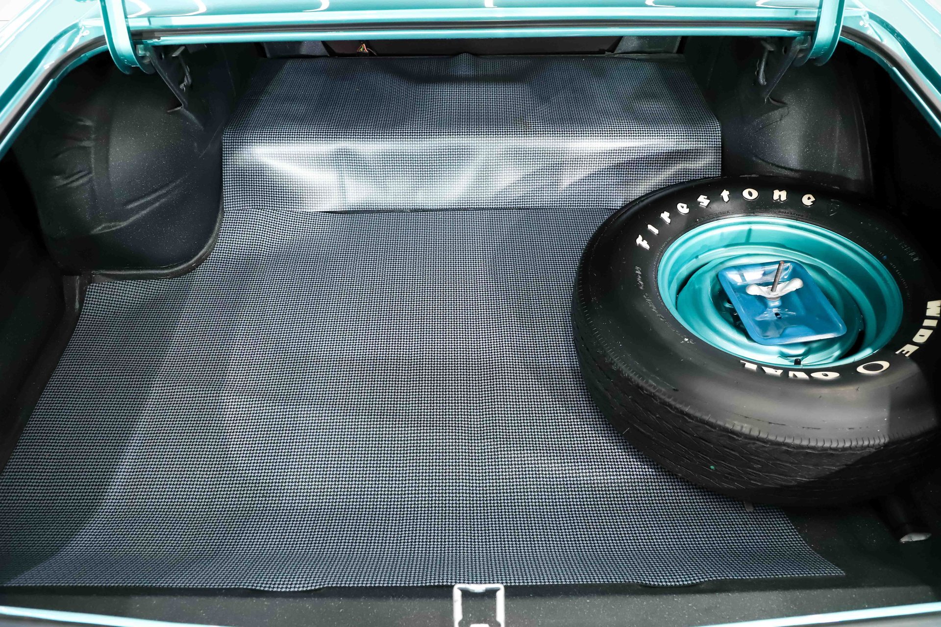 TRUNK COMPARTMENT: Like brand new! Under the trunk lid and inside the jamb are painted glossy like the car. Inside, the metal is spotless with a very neat spatter finish paint. It has reproduction stickers, trunk mat and weatherstrip. It's complete with a full size Firestone Wide Oval spare tire on a body color painted rim. It also comes with a detailed jack assembly and vinyl trunk mat too.
