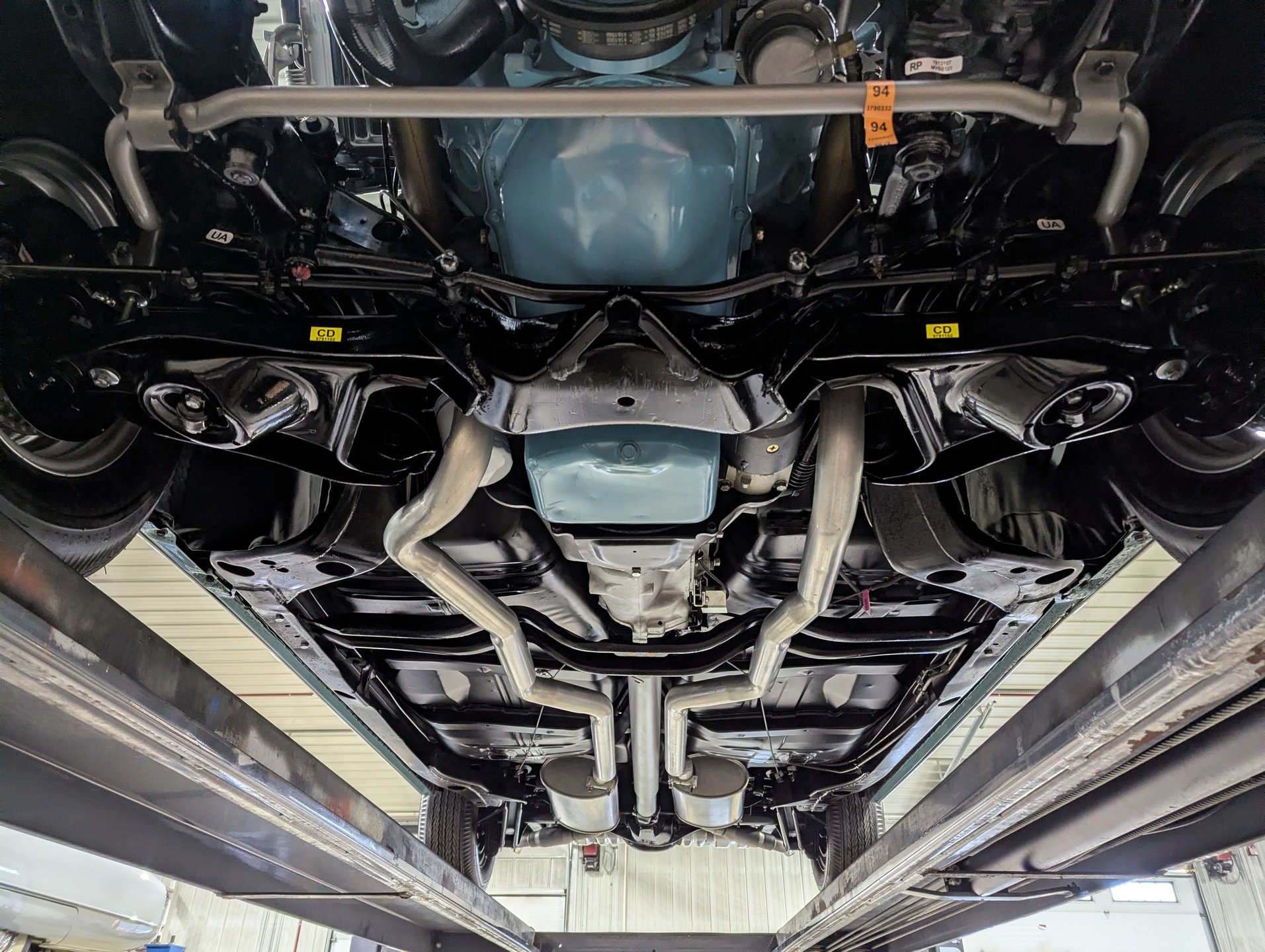 UNDERSIDE: Holy cow! It is detailed, it is fresh and it is absolutely beautiful. The body was off the frame, then the frame and chassis were glass beaded before powder coating. The suspension, steering, and brake system were fully rebuilt and everything functions wonderfully. It has a reproduction exhaust system with the correct mufflers and resonators in the tailpipes too. The fuel system was totally replaced including the tank. Looking up at the engine everything appears to be like new. Very stock in overall appearance with no aftermarket parts. The Muncie M20 4 speed manual transmission is correct for this car. Power gets transferred to a Safe-T-Track posi rear end with 3.23 gearing. The floors are absolutely immaculate including the braces and the inner rockers that are both neatly painted and satin black.