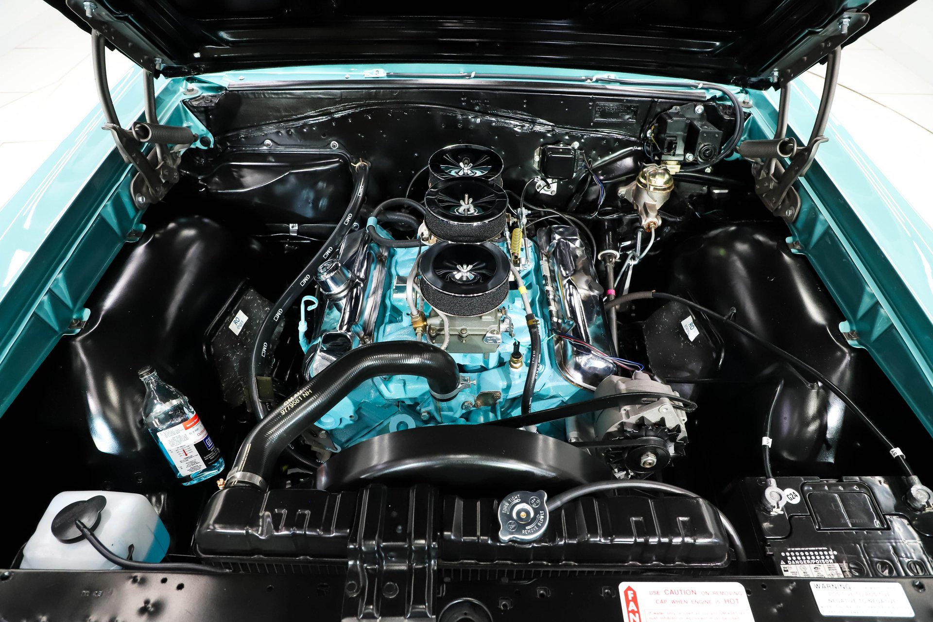 ENGINE COMPARTMENT: This is the original, #s matching motor as indicated by the protect-o-plate and it has the unit # on the block. If you have a 1965 GTO it has to have the tri-power! This one has a completely restored set and gives a spine-tingling induction sound that no single four barrel can match! The entire compartment is highly detailed to factory new. It has reproduction hoses, spring clamp battery cables, foam air filters, suspension dust shields, washer fluid bottle etc. All the surfaces are prepped and painted meticulously. Everything is spotless! What a proper engine bay!