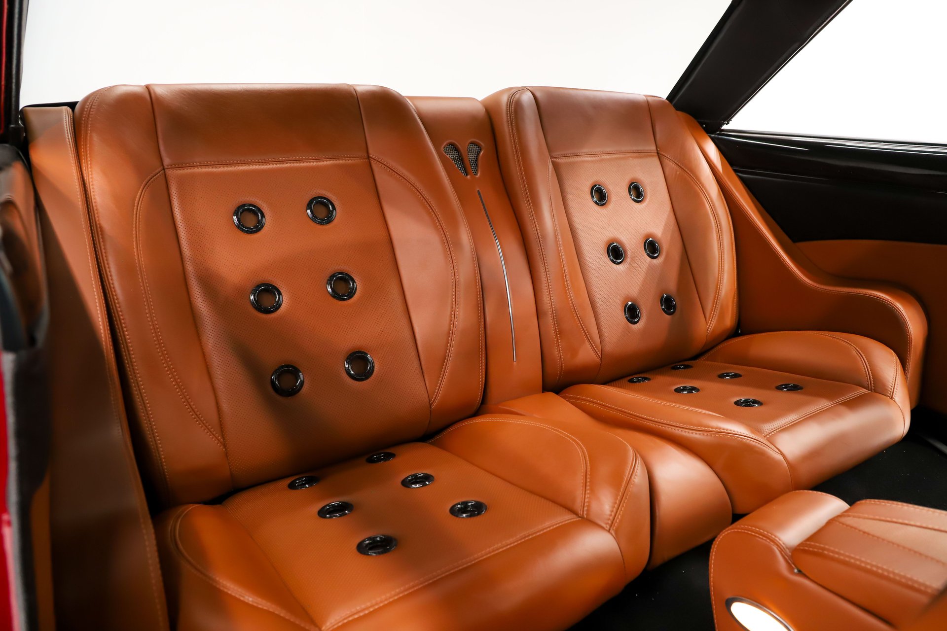 INTERIOR: First class in here! My words won't do it justice but I'll try, look at the pictures. Every square inch was professionally customized. There's so much sculpturing and 1 of a kind hand fabrication. It's upholstered in hand stitched, glove soft Italian leather. There are 4 bucket seats and a very nice center console. Custom sculpted side panels and rear shelf. The dash panel has a carbon fiber effect and premium billet Vintage Air controls and vents. A custom lower panel was made for a very finished look. The custom gauges show just 339 miles on the odometer. It uses an electric e-brake and a keyless ignition! You hit unlock on the key fob then push the starter button to fire up that NASCAR motor. The console is home to luxury items like power windows, a 12 volt receptacle, JBL Bluetooth stereo and cup holders. Too high class for you? That manual 6-speed shifter will remind you that you're in a wolf with sheep's clothes! You won't see the Fat Mat sound deadener or the amps and speakers but you will appreciate that they are there. The leather wrapped Billet Specialties wheel is on a polished column.