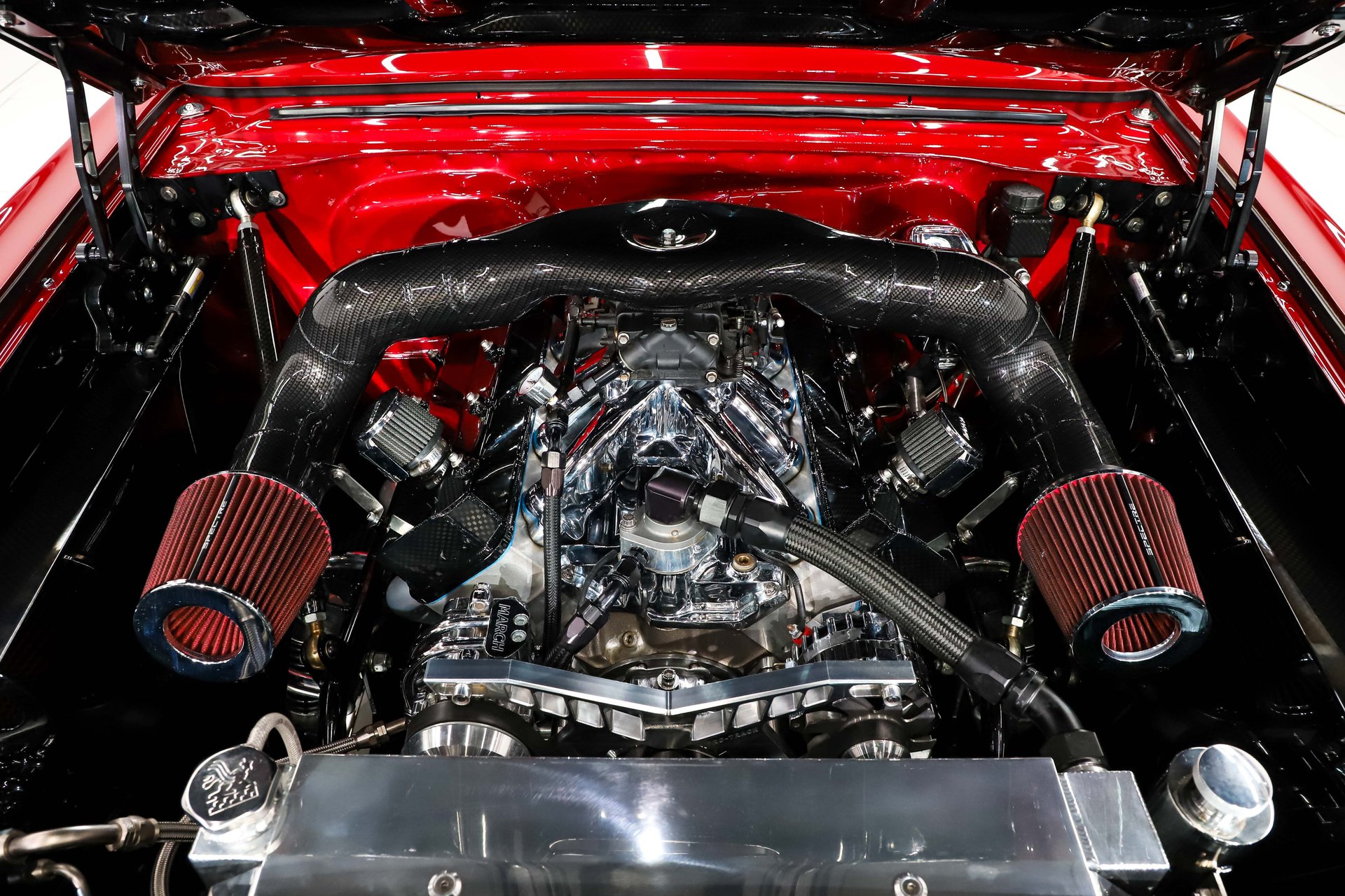 ENGINE COMPARTMENT: Hendricks Motorsports SB2 NASCAR engine. It's a 410 cubic inch small block making 700hp and capable of revving to 7,500 rpm! It has aluminum heads, polished Edelbrock Victor 2962 high rise NASCAR intake with a Holley 850 topping it off. It also has an MSD ignition and custom made Kooks polished long tube headers. In front is a March polished runner system including the brackets, serpentine pulleys, a/c compressor, alternator and a chrome power steering. The custom made dual snorkel cold air intake with Spectre filters matches the valve covers. It runs cool with an aluminum radiator and electric fans. All of the fittings and hoses are premium. Clean engine bay was smoothed out and painted slick, the wires and hoses are tucked away. Ring Brothers Air Frame billet hinges make opening the hood smooth as skippy. The support bars from the firewall to the frame are part of the TCI chassis.