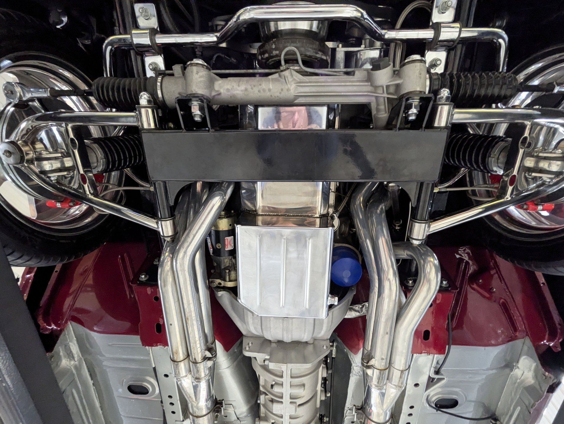 UNDERSIDE: It offers incredible all around high performance driving with a TCI Pro Touring chassis! Upfront it has a dual camber front clip with polished tubular control arms, polished drop spindles, polished swaybar, coilover adjustable gas shocks, rack & pinion steering. It has tubular frame connectors to prevent body twist. In back is a Torque Arm suspension which eliminates binding. It includes a telescoping torque arm, tubular control arms and panhard bar, polished swaybar and coilover adjustable gas shocks. Wilwood big brake kit with drilled and slotted discs at all 4 wheels, the e-brake lines are hidden and it uses the electric E-Stopp emergency brake. Highly polished stainless fabricated exhaust with crossover pipe and it is routed to a center exit NASCAR style tip. The custom fuel system with uses premium fittings, pump and braided lines. Looking up at the motor there is an extra capacity oil pan and a high torque starter. The trans is a Richmond Super Street 5-speed manual trans with a triple disc clutch and a lightweight flywheel. The driveshaft is polished aluminum and there's a Currie 9 inch rear with aluminum center section, 31 spline axles and 3.73 posi gears. The floors are clean metal painted silver. It is still new looking under this car.