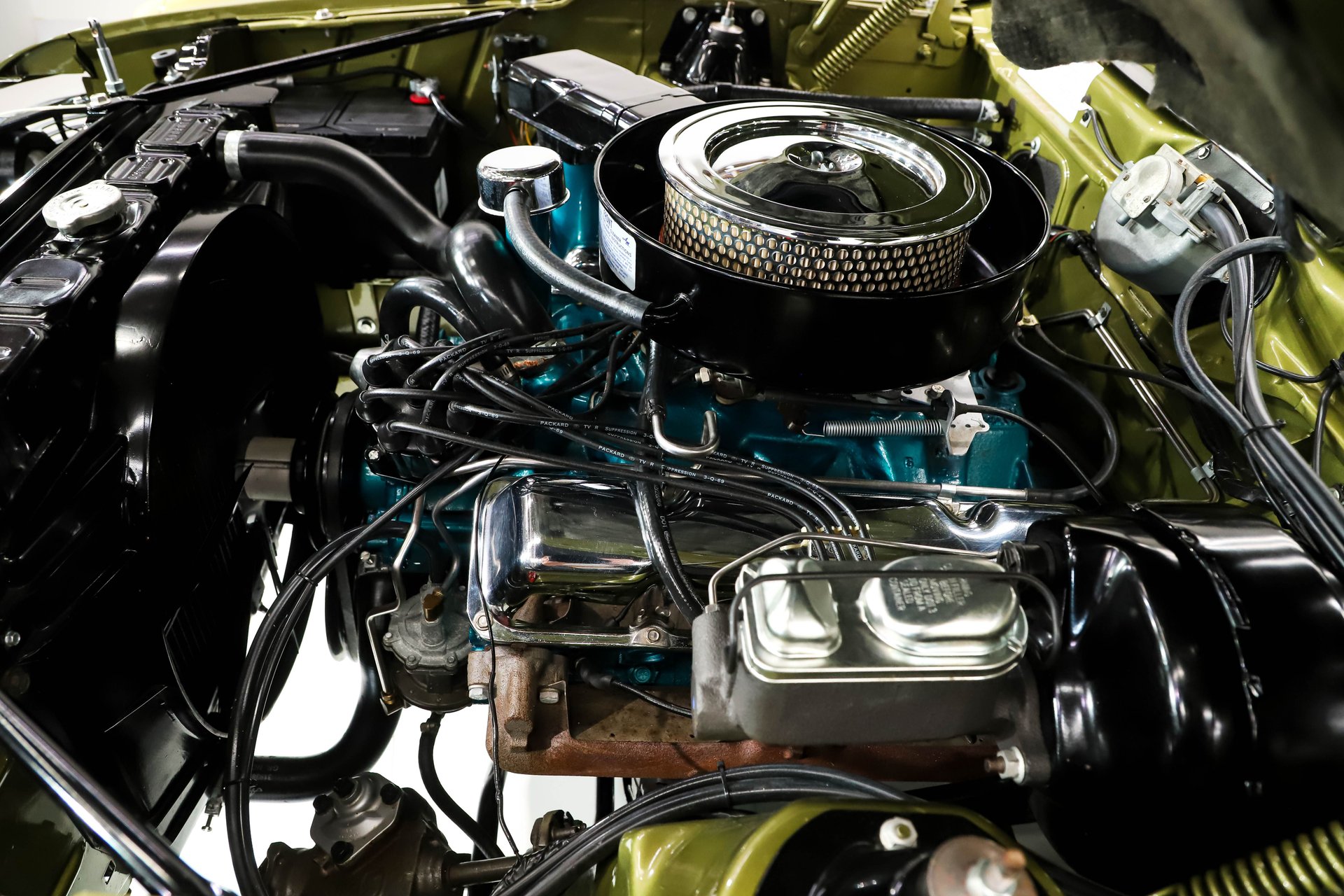 ENGINE COMPARTMENT: The engine bay is very highly detailed! At its core sits the correct 390 V8, producing 315 horsepower, completely stock with original manifolds, carburetor, and even the spark plug wires. On top, a fully functional Ram Air system is intact, complete with the heat riser tube. Every component is clean, properly fitted, and correct, including the reproduction American Motors belt. Power brakes are in place, and the paint and finishes throughout the bay are beautifully executed, it's mechanical jewelry!