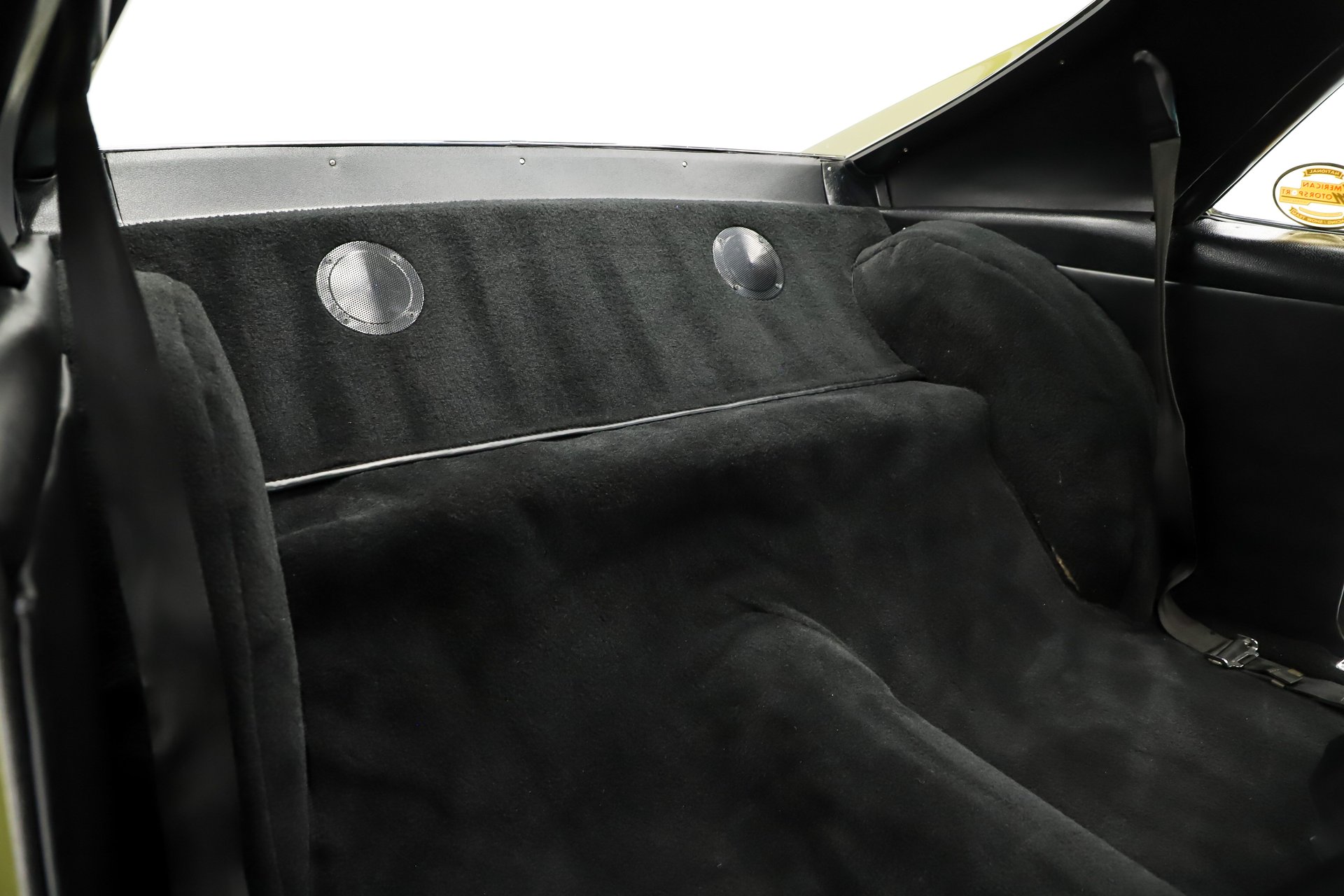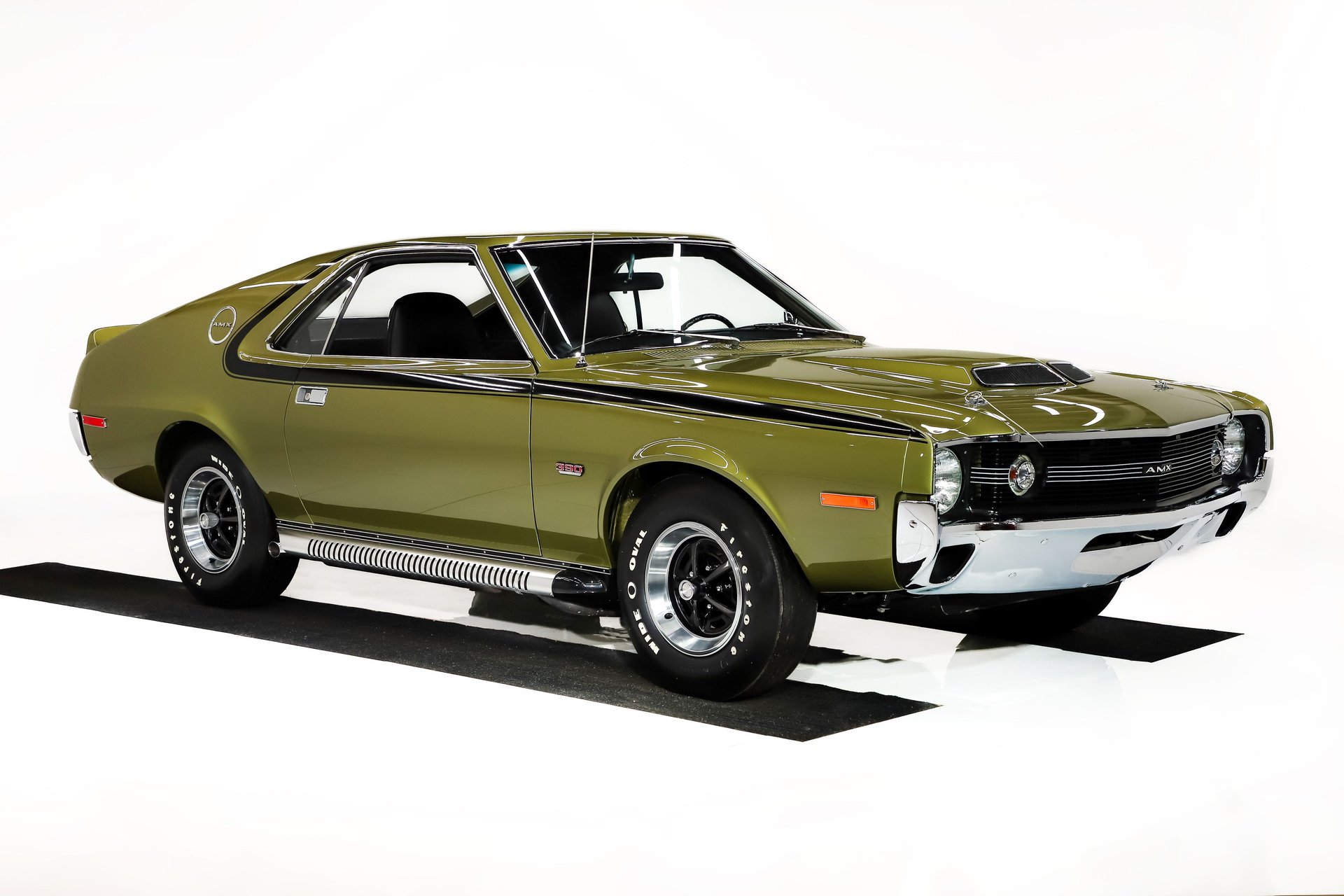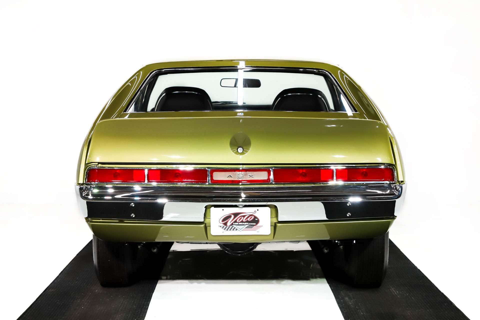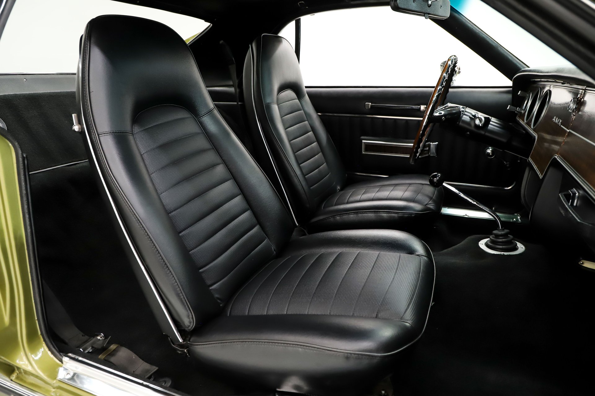 EXTERIOR: This AMX is likely better than it left the factory! Every inch of the body is straight as an arrow, with panels that fit square and flush. The original Golden Lime Metallic paint is evenly applied, topped with a glass-like polished clear coat. It's a much more vibrant color in the sunlight. The black decal striping, aggressive Ram Air hood and tall rear spoiler give it a commanding presence.