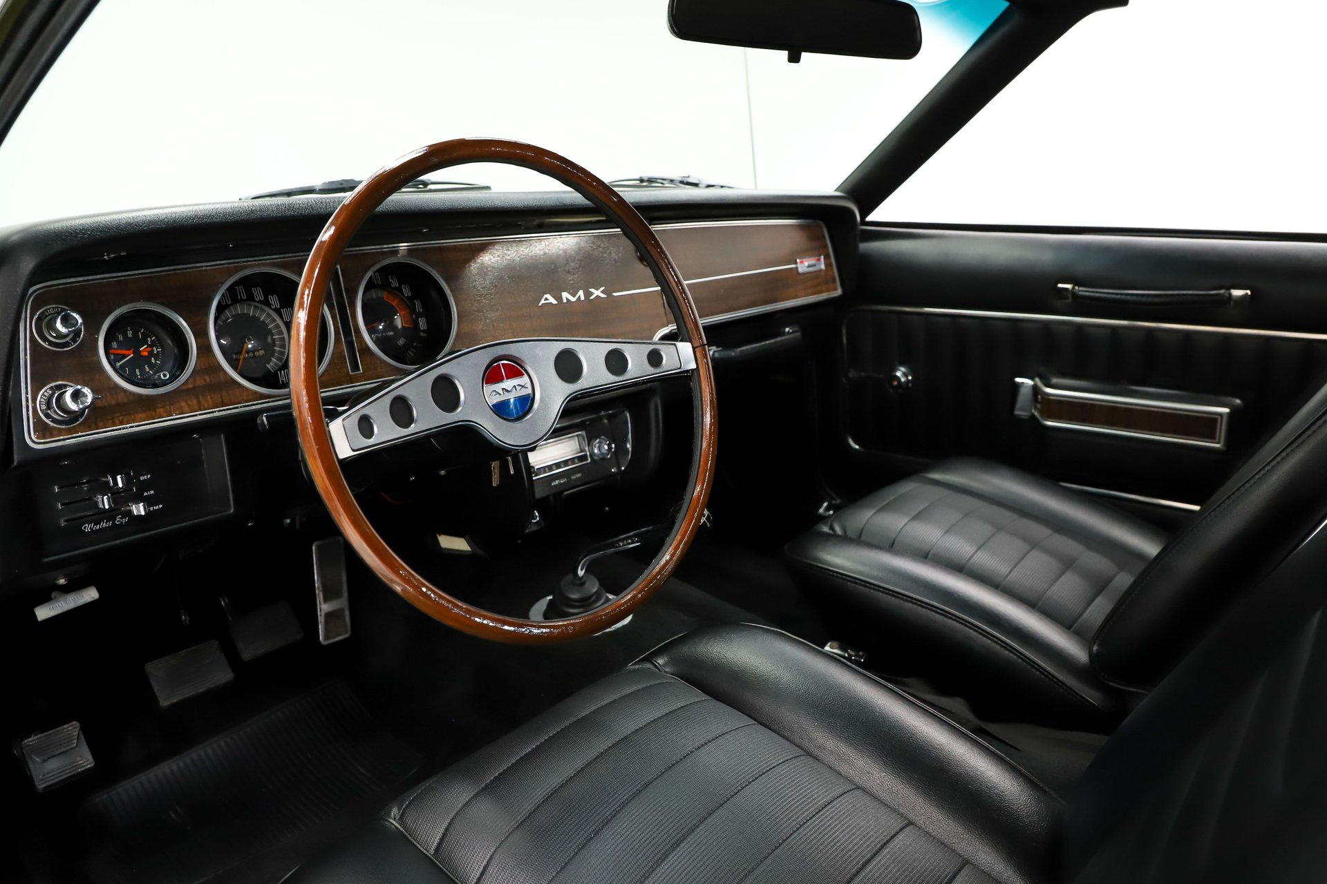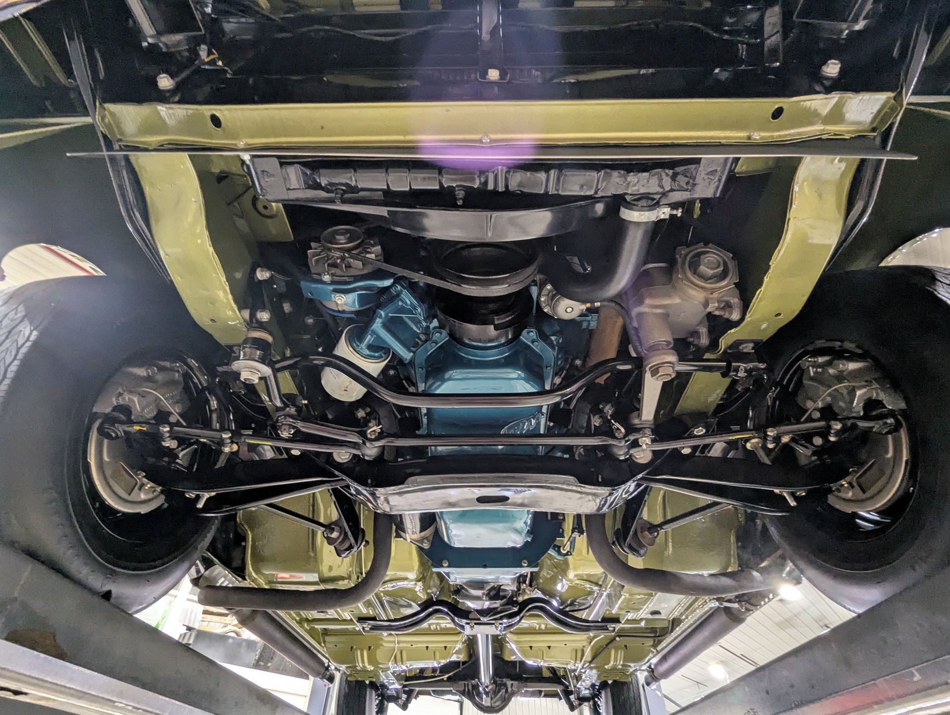 UNDERSIDE: Underneath, this AMX is fully restored and highly detailed—you'll want to put mirrors under it at shows. The suspension and steering were completely disassembled, prepped, painted, and rebuilt, while the brake system has been entirely redone, featuring front disc brakes for modern stopping power. The fuel system has been replaced, and looking up at the motor, everything is spotless, including the correct starter.