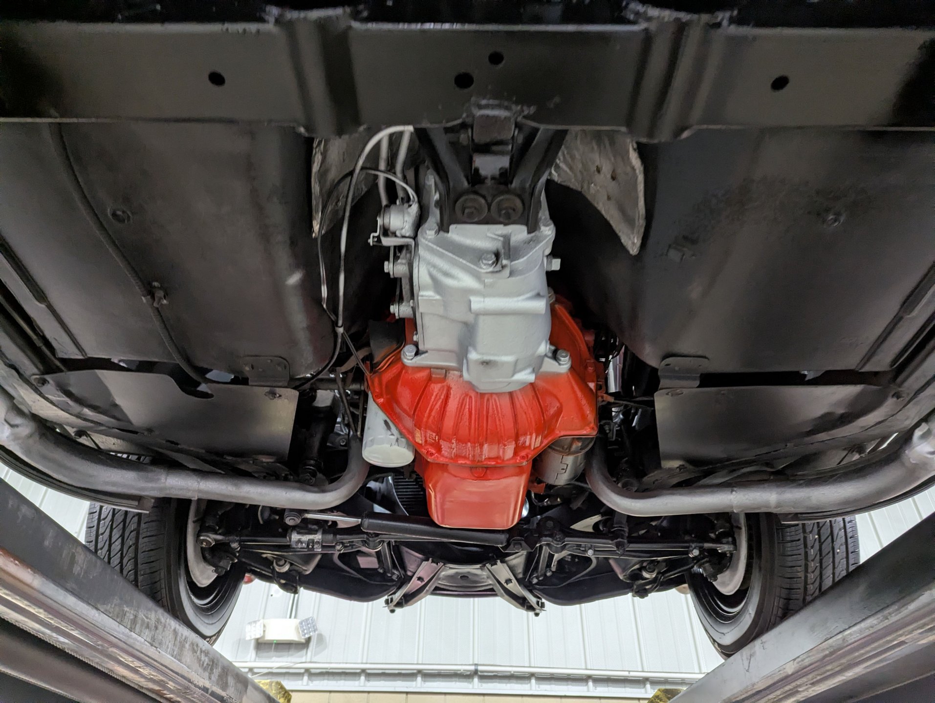 Looking up at the drivetrain, the engine is tidy and correct, including the proper starter and the rare, original three-speed manual transmission. Out back, it still carries its original coded and dated 3.36 rear end, completing a remarkably authentic and well-preserved undercarriage.